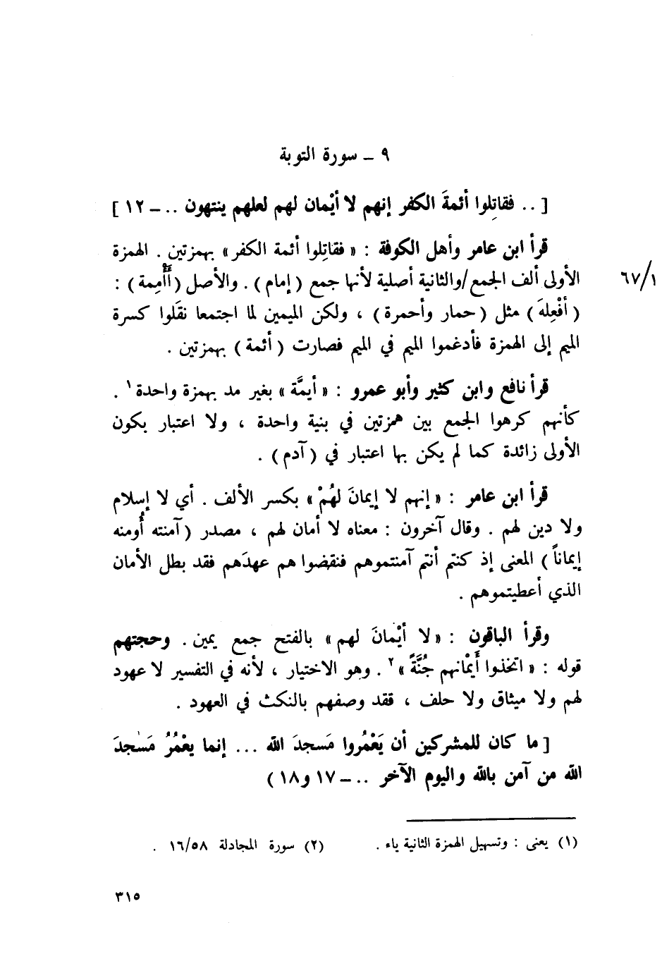 قَرَأَ ابْن عَامر وَأهل الْكُوفَة {فَقَاتلُوا أَئِمَّة الْكفْر} بهمزتين الْهمزَة الأولى ألف الْجمع وَالثَّانيَِة أَصْلِيَّة لِأَنَّهَا جمع إِمَام وَالْأَصْل أأممة أَفعلهُ مثل حمَار وأحمرة وَلَكِن الميمين لما اجْتمعَا نقلوا كسرة الْمِيم إِلَى الْهمزَة فأدغموا الْمِيم فِي الْمِيم فَصَارَت أَئِمَّة بهمزتين