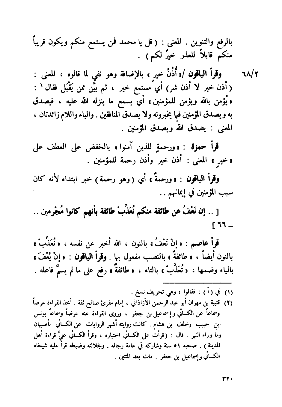 قَرَأَ عَاصِم {إِن نعف} بالنُّون الله أخبر عَن نَفسه {نعذب} بالنُّون أَيْضا {طَائِفَة} بَال مفعول بهَا وَقَرَأَ الْبَاقُونَ / إِن يعف / بِالْيَاءِ وَضمّهَا {تعذب} بِالتَّاءِ {طَائِفَة} رفع على مَا لم يسم فَاعله