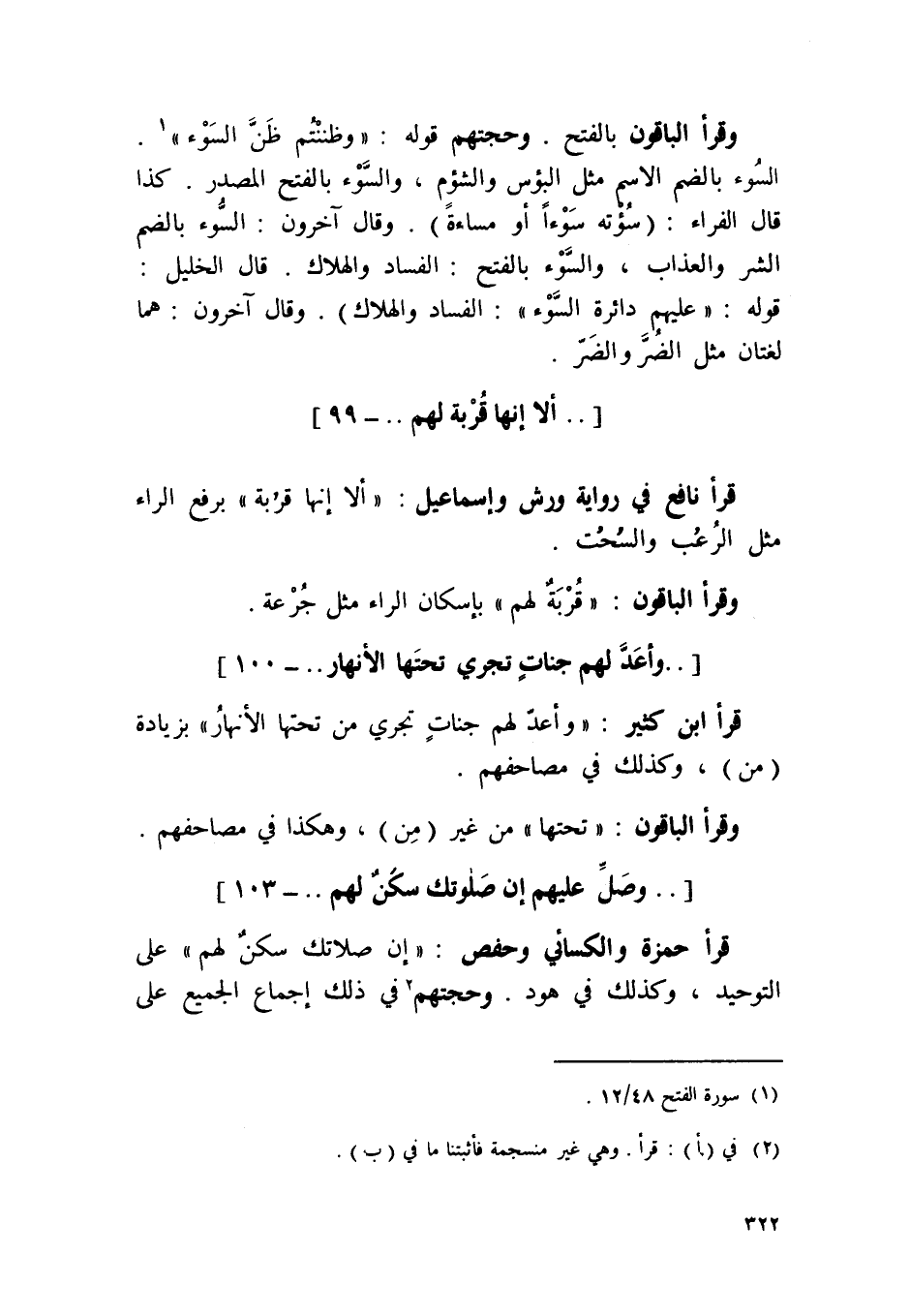 وَقَرَأَ الْبَاقُونَ بِالْفَتْح وحجتهم قَوْله {وظننتم ظن السوء} السوء بِالضَّمِّ الِاسْم مثل الْبُؤْس والشؤم وَالسوء بِالْفَتْح الْمصدر كَذَا قَالَ الْفراء سؤته سوءا أَو مساءة وَقَالَ آخَرُونَ السوء بِالضَّمِّ الشَّرّ وَالْعَذَاب وَالسوء بِالْفَتْح الْفساد والهلاك قَالَ الْخَلِيل قَوْله {عَلَيْهِم دَائِرَة السوء} الْفساد والهلاك وَقَالَ آخَرُونَ هما لُغَتَانِ مثل الضّر والضر