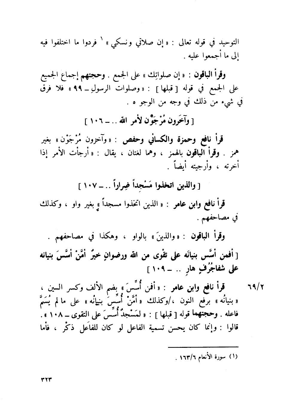 قَرَأَ نَافِع وَابْن عَامر {أَفَمَن أسس} بِضَم الْألف وَكسر السِّين {بُنْيَانه} بِرَفْع النُّون وَكَذَلِكَ {أم من أسس بُنْيَانه} على مَا لم يسم فَاعله وحجتهما قَوْله قبلهَا {لمَسْجِد أسس على التَّقْوَى} قَالُوا وَإِنَّمَا كَانَ يحسن تَسْمِيَة الْفَاعِل لَو كَانَ للْفَاعِل ذكر فَأَما