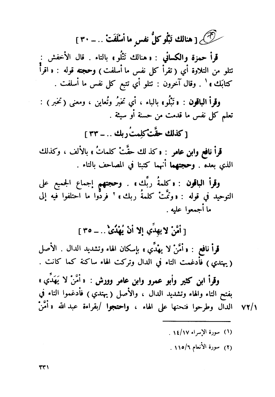 قَرَأَ حَمْزَة وَالْكسَائِيّ / هُنَالك تتلو / بِالتَّاءِ قَالَ الْأَخْفَش تتلو من التِّلَاوَة أَي تقْرَأ كل نفس مَا أسلفت وحجته قَوْله {اقْرَأ كتابك} وَقَالَ آخَرُونَ {تتلو} أَي تتبع كل نفس مَا أسلفت