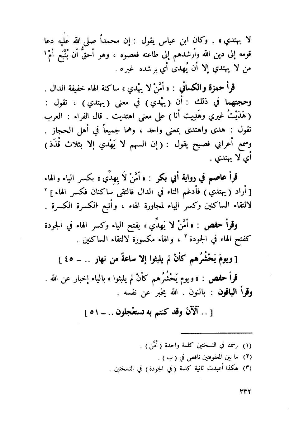 قَرَأَ حَمْزَة وَالْكسَائِيّ / أَمن لَا يهدي / سَاكِنة الْهَاء خَفِيفَة الدَّال وحجتهما فِي ذَلِك أَن يهدي فِي معنى يَهْتَدِي تَقول هديت غَيْرِي وهديت أَنا على معنى اهتديت قَالَ الْفراء الْعَرَب تَقول هدى واهتدى بِمَعْنى وَاحِد وهما جَمِيعًا فِي أهل الْحجاز وَسمع أَعْرَابِي فصيح يَقُول إِن السهْم لَا يهدي إِلَّا بِثَلَاث قذذ أَي لَا يَهْتَدِي
