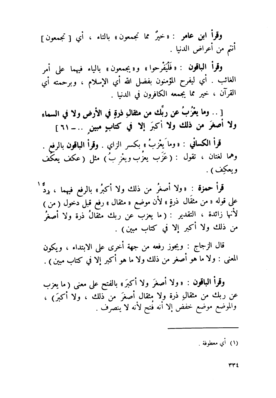 قَرَأَ حَمْزَة {وَلَا أَصْغَر من ذَلِك وَلَا أكبر} بِالرَّفْع فيهمَا رد على قَوْله {من مِثْقَال ذرة} لِأَن مَوضِع {مِثْقَال} رفع قبل دُخُول من لِأَنَّهَا زَائِدَة التَّقْدِير مَا يعزب عَن رَبك مِثْقَال ذرة وَلَا أَصْغَر من ذَلِك وَلَا أكبر إِلَّا فِي كتاب مُبين
