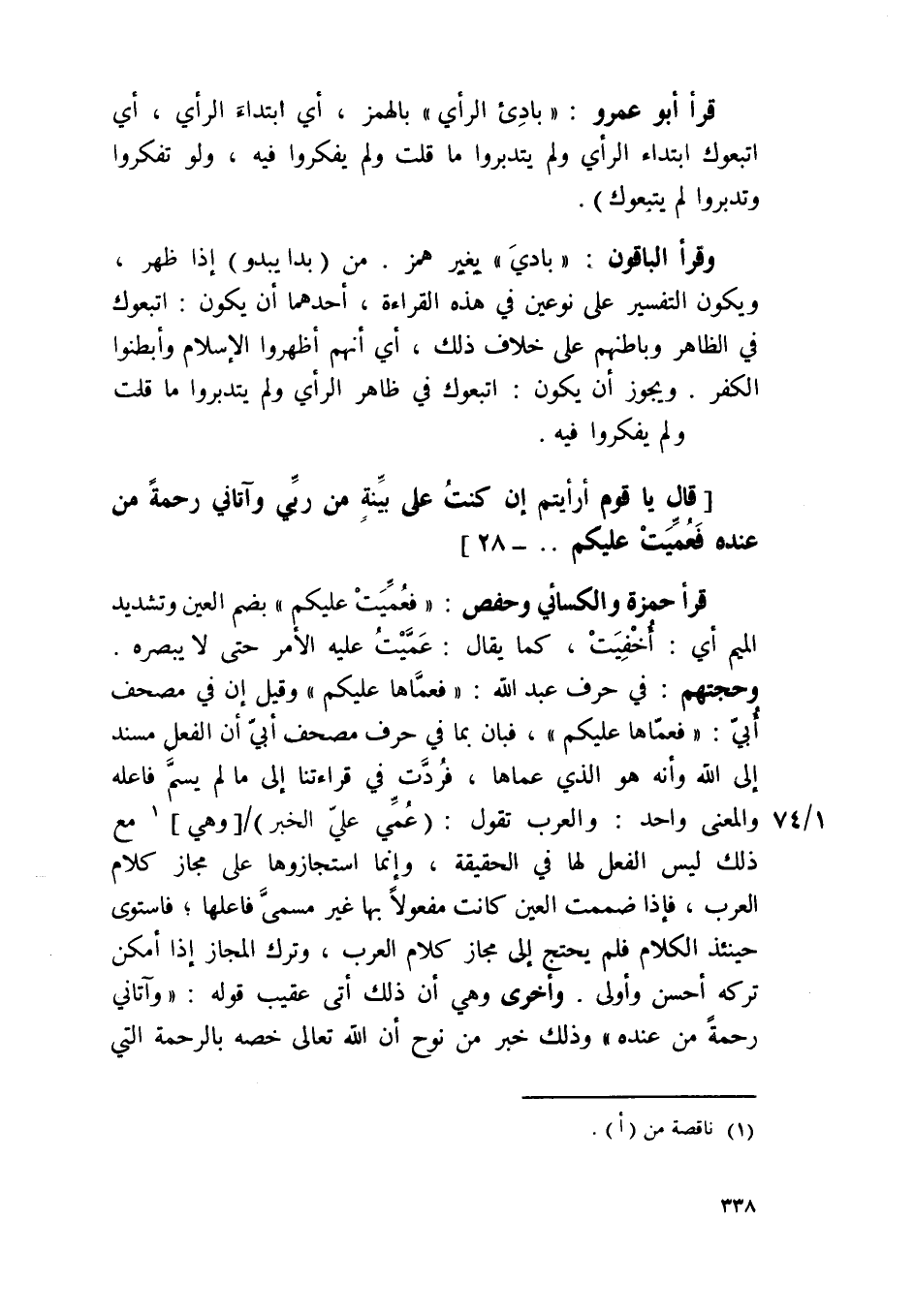 قَرَأَ حَمْزَة وَالْكسَائِيّ وَحَفْص {فعميت عَلَيْكُم} بِضَم الْعين وَتَشْديد الْمِيم أَي أخفيت كَمَا يُقَال عميت عَلَيْهِ الْأَمر حَتَّى لَا يبصره وحجتهم فِي حرف عبد الله / فعماها عَلَيْكُم / وَقيل إِن فِي مصحف أبي / فعماها عَلَيْكُم / فَبَان بِمَا فِي حرف مصحف أبي أَن الْفِعْل مُسْند إِلَى الله وَأَنه هُوَ الَّذِي عماها فَردَّتْ فِي قراءتنا إِلَى مَا لم يسم فَاعله وَالْمعْنَى وَاحِد وَالْعرب تَقول عمي على الْخَبَر وَهِي مَعَ ذَلِك لَيْسَ الْفِعْل لَهَا فِي الْحَقِيقَة وَإِنَّا استجازوها على مجَاز كَلَام الْعَرَب فَإِذا ضممت الْعين كَانَت مَفْعُولا بهَا غير مُسَمّى فاعلها فَاسْتَوَى حِينَئِذٍ الْكَلَام فَلم يحْتَج إِلَى مجَاز كَلَام الْعَرَب وَترك الْمجَاز إِذا أمكن تَركه أحسن وَأولى وَأُخْرَى وَهِي أَن ذَلِك أَتَى عقيب قَوْله {وآتاني رَحْمَة من عِنْده} وَذَلِكَ خبر من نوح أَن الله تَعَالَى خصّه بِالرَّحْمَةِ الَّتِي