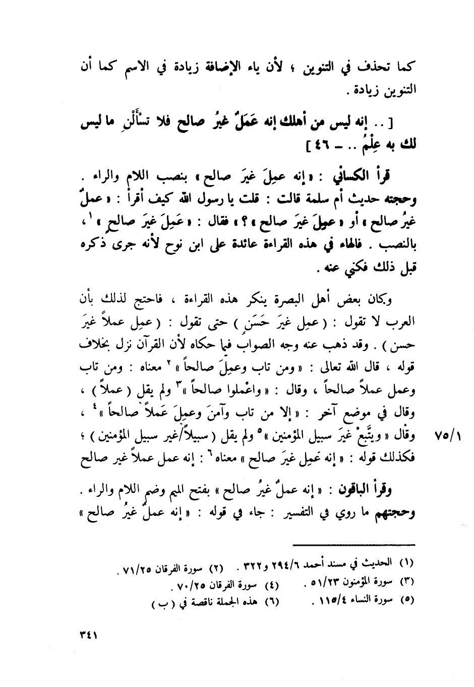 وَكَانَ بعض أهل الْبَصْرَة يُنكر هَذِه الْقِرَاءَة فاحتج لذَلِك بِأَن الْعَرَب لَا تَقول عمل غير حسن حَتَّى تَقول عمل عملا غير حسن وَقد ذهب عَنهُ وَجه الصَّوَاب فِيمَا حَكَاهُ لِأَن الْقُرْآن نزل بِخِلَاف قَوْله قَالَ الله تَعَالَى {وَمن تَابَ وَعمل صَالحا} مَعْنَاهُ وَمن تَابَ وَعمل عملا صَالحا وَقَالَ {وَاعْمَلُوا صَالحا} وَلم يقل عملا وَقَالَ فِي مَوضِع آخر {إِلَّا من تَابَ وآمن وَعمل عملا صَالحا} وَقَالَ {وَيتبع غير سَبِيل الْمُؤمنِينَ} وَلم يقل سَبِيلا غير سَبِيل الْمُؤمنِينَ فَكَذَلِك قَوْله إِنَّه عمل غير صَالح مَعْنَاهُ إِنَّه عمل عملا غير صَالح
