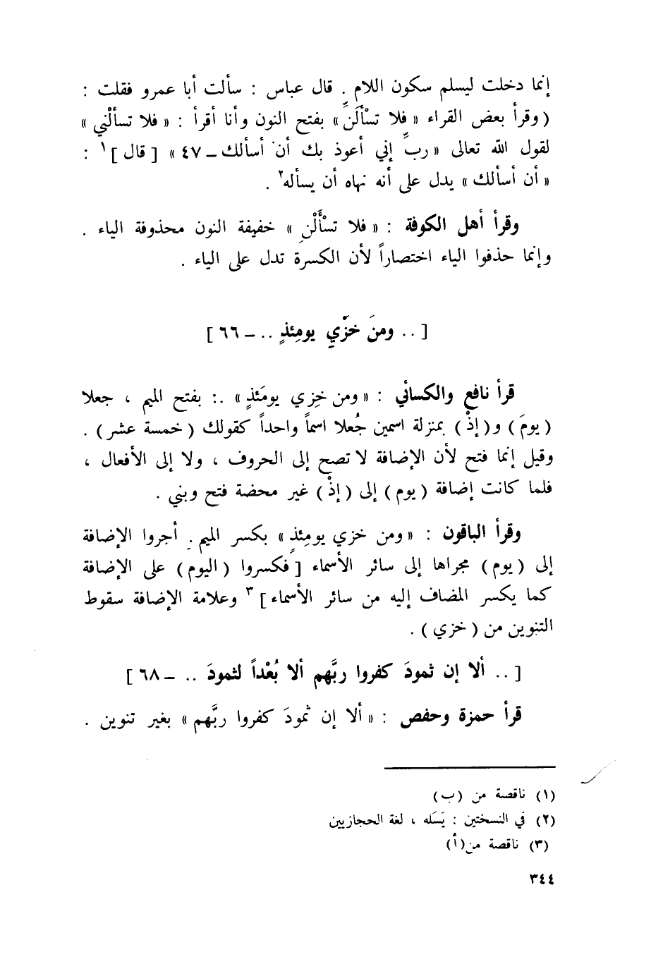 وَقَرَأَ أهل الْكُوفَة {فَلَا تسألن} خَفِيفَة النُّون محذولة الْيَاء وَإِنَّمَا حذفوا الْيَاء اختصارا لِأَن الكسرة تدل على الْيَاء