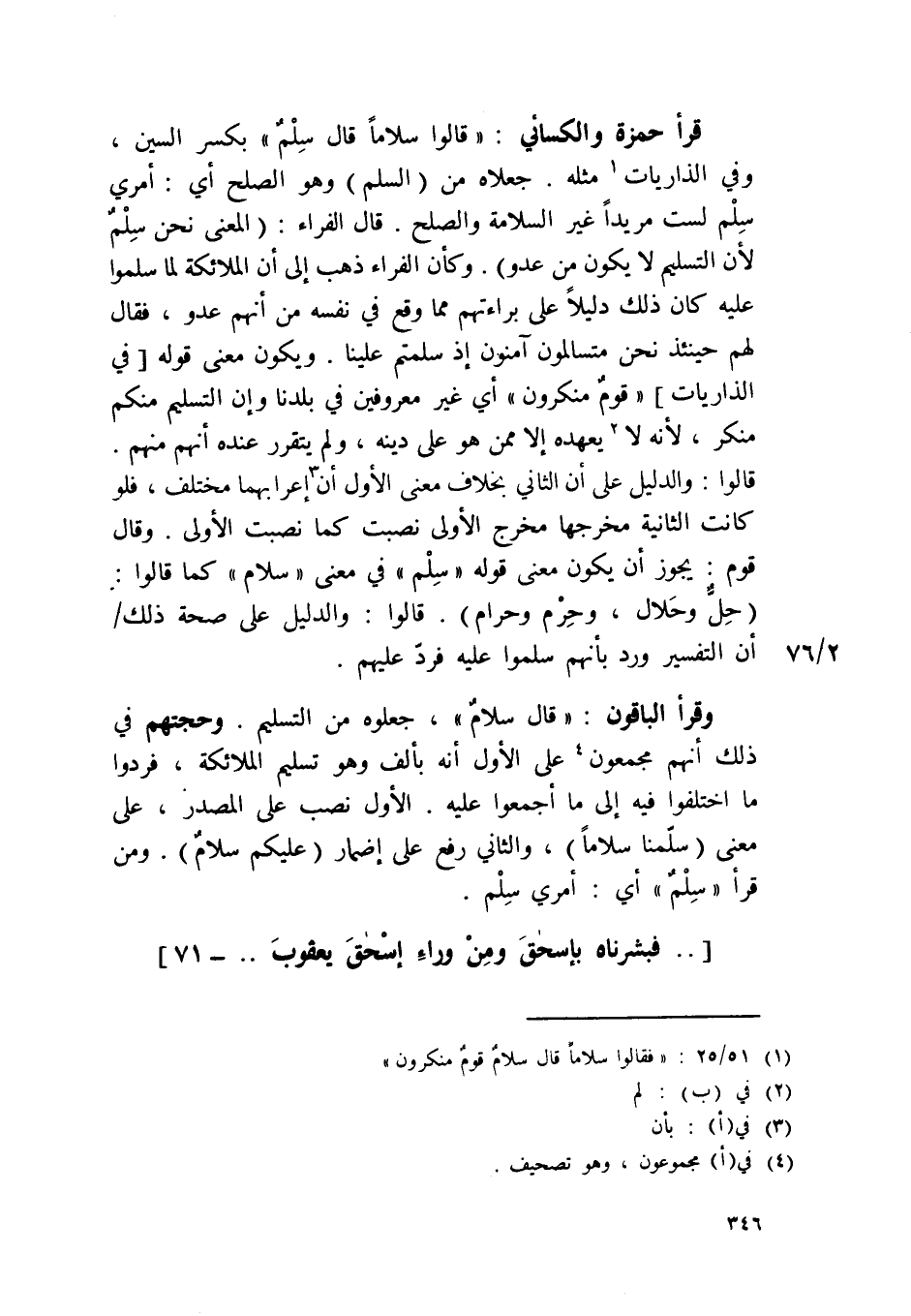 قَرَأَ حَمْزَة وَالْكسَائِيّ / قَالُوا سَلاما قَالَ سلم / بِكَسْر السِّين وَفِي الذاريات مثله جعلاه من السّلم وَهُوَ الصُّلْح أَي أَمْرِي سلم لست مرِيدا غير السَّلامَة وَالصُّلْح قَالَ الْفراء الْمَعْنى نَحن سلم لِأَن التَّسْلِيم لَا يكون من عَدو وَكَأن الْفراء ذهب إِلَى أَن الْمَلَائِكَة لما سلمُوا عَلَيْهِ كَانَ ذَلِك دَلِيلا على براءتهم مِمَّا وَقع فِي نَفسه من أَنهم عَدو فَقَالَ لَهُم حِينَئِذٍ نَحن متسالمون آمنون إِذْ سلمتم علينا وَيكون معنى قَوْله فِي الذاريات {قوم منكرون} أَي غير معروفين فِي بلدنا وَإِن التَّسْلِيم مِنْكُم مُنكر لِأَنَّهُ لَا يعهده إِلَّا مِمَّن هُوَ على دينه وَلم يَتَقَرَّر عِنْده أَنهم مِنْهُم قَالُوا وَالدَّلِيل على أَن الثَّانِي بِخِلَاف معنى الأول أَن إعرابهما مُخْتَلف فَلَو كَانَت الثَّانِيَة مخرجها مخرج الأولى نصبت كَمَا نصبت الأولى وَقَالَ قوم يجوز أَن يكون معنى قَوْله {سلم} فِي معنى سَلام كَمَا قَالُوا حل وحلال وَحرم وَحرَام قَالُوا وَالدَّلِيل على صِحَة ذَلِك أَن التَّفْسِير ورد بِأَنَّهُم سلمُوا عَلَيْهِ فَرد عَلَيْهِم