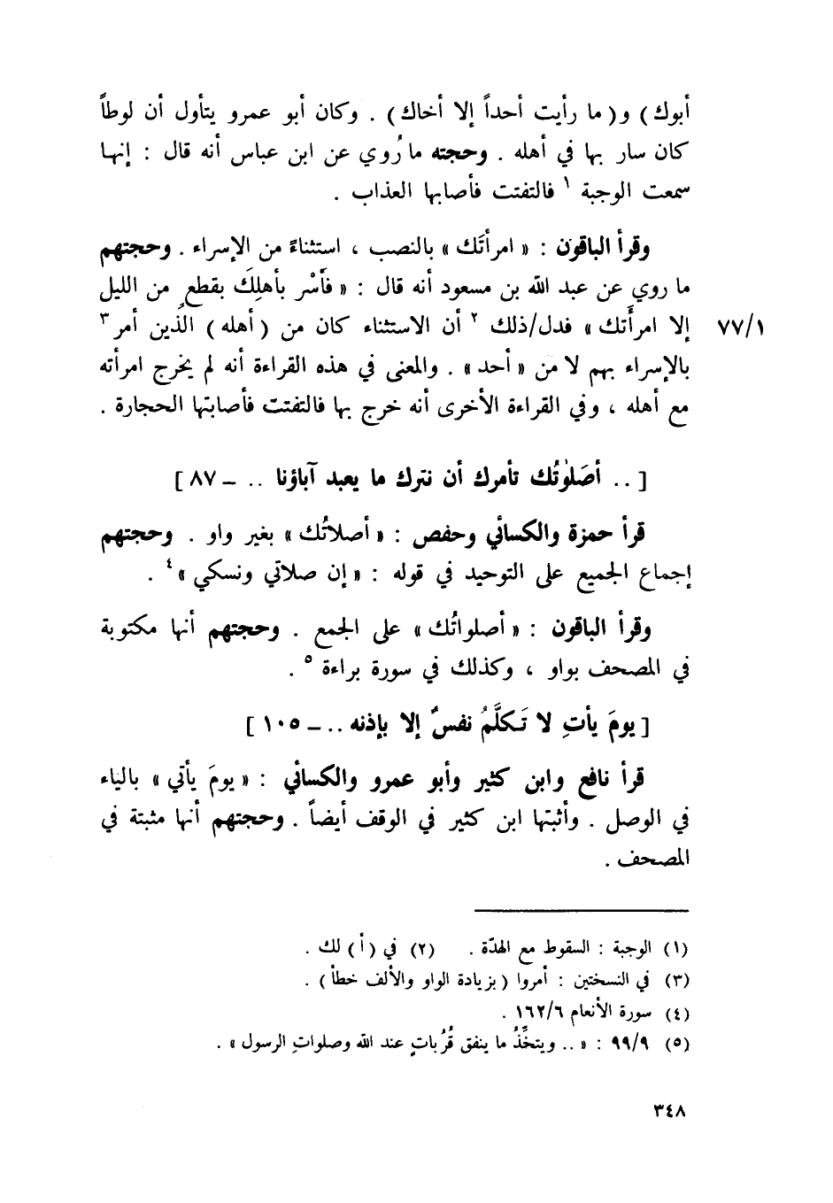 وَقَرَأَ الْبَاقُونَ {امْرَأَتك} بِالنّصب اسْتثِْنَاء من الْإِسْرَاء وحجتهم مَا رُوِيَ عَن عبد الله بن مَسْعُود أَنه قَالَ {فَأسر بأهلك بِقطع من اللَّيْل} {إِلَّا امْرَأَتك} فَدلَّ ذَلِك ان الِاسْتِثْنَاء كَانَ من أَهله الَّذين أَمر بالإسراء بهم لَا من {أحد} وَالْمعْنَى فِي هَذِه الْقِرَاءَة أَنه لم يخرج امْرَأَته مَعَ أَهله وَفِي الْقِرَاءَة الْأُخْرَى أَنه خرج بهَا فالتفتت فأصابتها الْحِجَارَة
