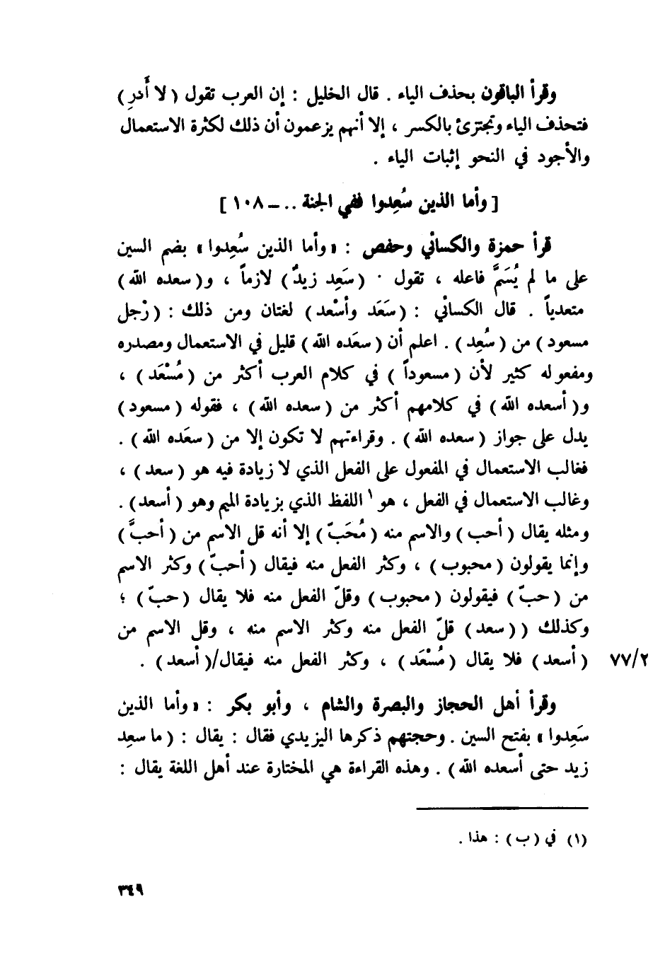 قَرَأَ حَمْزَة وَالْكسَائِيّ وَحَفْص {وَأما الَّذين سعدوا} بِضَم السِّين على مَا لم يسم فَاعله تَقول سعد زيد لَازِما وسعده الله مُتَعَدِّيا قَالَ الْكسَائي سعد واسعد لُغَتَانِ وَمن ذَلِك رجل مَسْعُود من سعد اعْلَم أَن سعده الله قَلِيل فِي الِاسْتِعْمَال ومصدره ومفعوله كثير لِأَن مسعودا فِي كَلَام الْعَرَب أَكثر من مسعد وأسعده الله فِي كَلَامهم أَكثر من سعده الله فَقَوْل مَسْعُود يدل على جَوَاز سعده الله وقراءتهم لَا تكون إِلَّا من سعده الله فغالب الِاسْتِعْمَال فِي الْمَفْعُول على الْفِعْل الَّذِي لَا زِيَادَة فِيهِ هُوَ سعد وغالب الِاسْتِعْمَال فِي الْفِعْل هُوَ اللَّفْظ الَّذِي بِزِيَادَة الْمِيم وَهُوَ أسعد وَمثله يُقَال أحب وَالِاسْم مِنْهُ محب إِلَّا أَنه قل الِاسْم من أحب وَإِنَّمَا يَقُولُونَ مَحْبُوب وَكثر الْفِعْل مِنْهُ فَيُقَال أحب وَكثر الِاسْم من حب فَيَقُولُونَ مَحْبُوب وَقل الْفِعْل مِنْهُ فَلَا يُقَال حب وَكَذَلِكَ سعد قل الْفِعْل مِنْهُ وَكثر الِاسْم مِنْهُ وَقل الِاسْم من أسعد فَلَا يُقَال مسعد وَكثر الْفِعْل مِنْهُ فَيُقَال أسعد