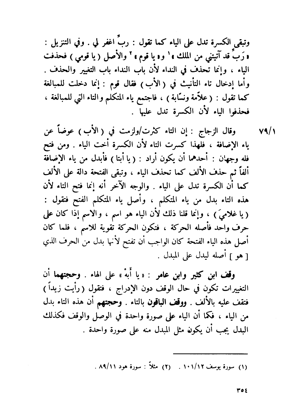 وقف ابْن كثير وَابْن عَامر / يَا أبه / على الْهَاء وحجتهما أَن التغييرات تكون فِي حَال الْوَقْف دون الإدراج فَتَقول رايت زيدا فتقف عَلَيْهِ بِالْألف ووقف الْبَاقُونَ بِالتَّاءِ وحجتهم أَن هَذِه التَّاء بدل من الْيَاء فَكَمَا أَن الْيَاء على صُورَة وَاحِدَة فِي الْوَصْل وَالْوَقْف فَكَذَلِك الْبَدَل يجب أَن يكون مثل الْمُبدل مِنْهُ على صُورَة وَاحِدَة