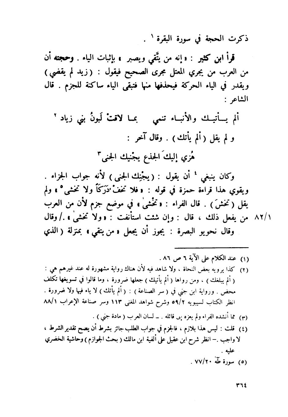 قَرَأَ ابْن كثير / إِنَّه من يتقى ويصبر / بِإِثْبَات الْيَاء وحجته أَن من الْعَرَب من يجْرِي المعتل مجْرى الصَّحِيح فَيَقُول زيد لم يقْضِي وَيقدر فِي الْيَاء الْحَرَكَة فيحذفها مِنْهَا فَتبقى الْيَاء سَاكِنة للجزم قَالَ الشَّاعِر ... ألم يأتك والأنباء تنمي ... بِمَا لاقت لبون بني زِيَاد ...