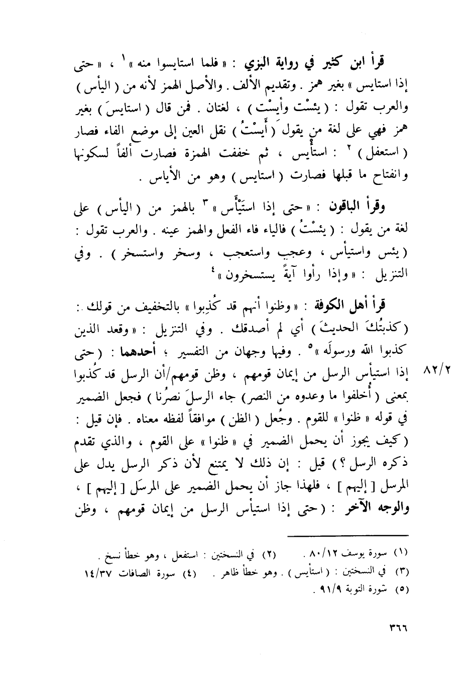 قَرَأَ ابْن كثير فِي رِوَايَة البزي فَلَمَّا / استايسوا مِنْهُ / / حَتَّى إِذا استايس / بِغَيْر همز وَتَقْدِيم الْألف وَالْأَصْل الْهَمْز لِأَنَّهُ من الْيَأْس وَالْعرب تَقول يئست وأيست لُغَتَانِ فَمن قَالَ استايس بِغَيْر همز فَهِيَ على لُغَة من يَقُول أَيِست نقل الْعين إِلَى مَوضِع الْفَاء فَصَارَ استعفل استأيس ثمَّ خففت الْهمزَة فَصَارَت ألفا لسكونها وانفتاح مَا قبلهَا فَصَارَت استايس وَهُوَ من الأياس