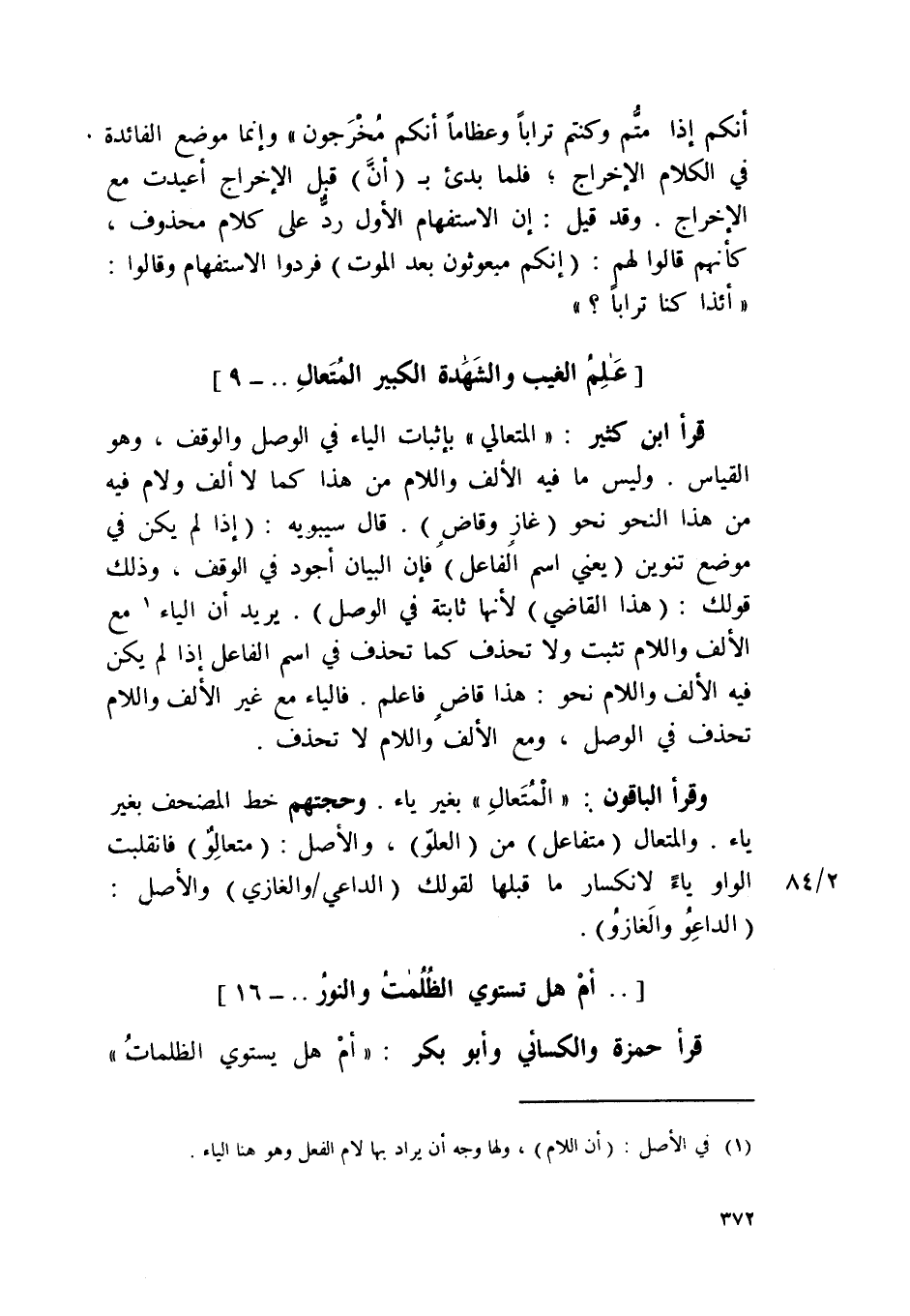 قَرَأَ ابْن كثير / المتعالي / بِإِثْبَات الْيَاء فِي الْوَصْل وَالْوَقْف وَهُوَ الْقيَاس وَلَيْسَ مَا فِيهِ الْألف وَاللَّام من هَذَا كَمَا لَا ألف وَلَام فِيهِ من هَذَا النَّحْو نَحْو غاز وقاض قَالَ سِيبَوَيْهٍ إِذا لم يكن فِي مَوضِع تَنْوِين يَعْنِي اسْم الْفَاعِل فَإِن الْبَيَان أَجود فِي الْوَقْف وَذَلِكَ قَوْلك هَذَا القَاضِي لِأَنَّهَا ثَابِتَة فِي الْوَصْل يُرِيد أَن الْيَاء مَعَ الْألف وَاللَّام تثبت وَلَا تحذف كَمَا تحذف فِي اسْم الْفَاعِل إِذا لم يكن فِيهِ الْألف وَاللَّام نَحْو هَذَا قَاض فَاعْلَم فالياء مَعَ غير الْألف وَاللَّام تحذف فِي الْوَصْل وَمَعَ الْألف وَاللَّام لَا تحذف
