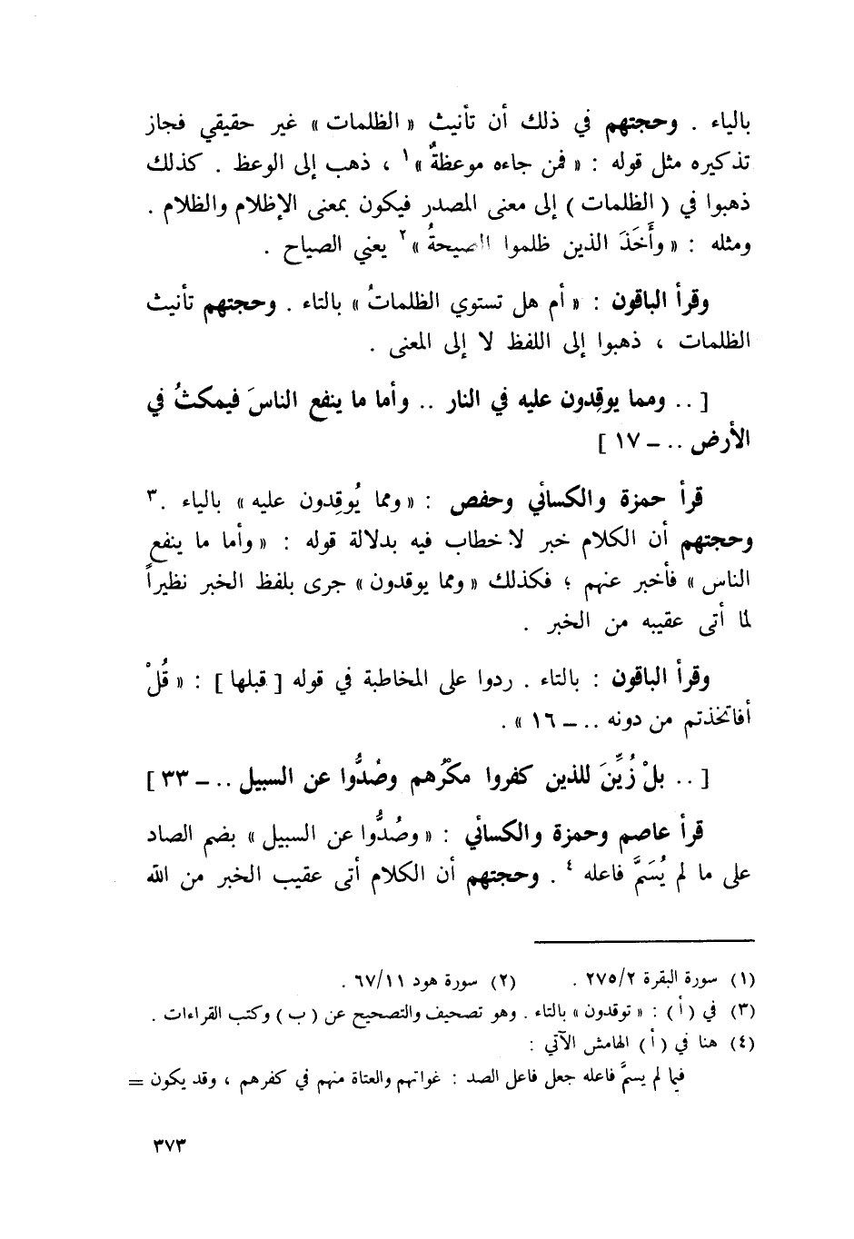 وَقَرَأَ الْبَاقُونَ {أم هَل تستوي الظُّلُمَات} بِالتَّاءِ وحجتهم تَأْنِيث الظُّلُمَات ذَهَبُوا إِلَى اللَّفْظ لَا إِلَى الْمَعْنى