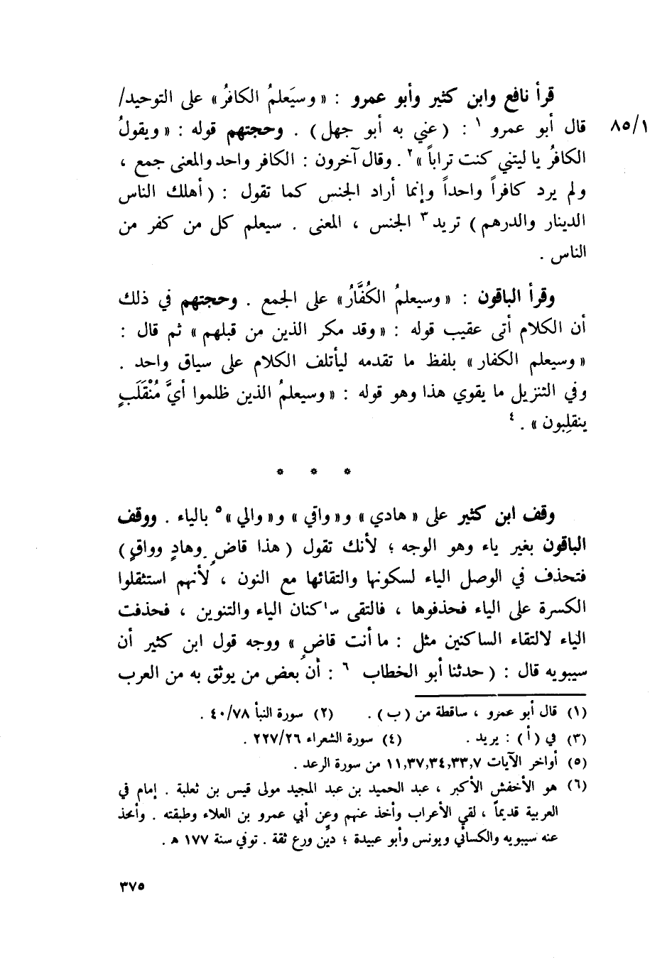 وقف ابْن كثير على {هادي} و / واقي / و {وَإِلَى} بِالْيَاءِ ووقف الْبَاقُونَ بِغَيْر يَاء وَهُوَ الْوَجْه لِأَنَّك تَقول هَذَا قَاض وهاد وواق فتحذف فِي الْوَصْل الْيَاء لسكونها والتقائها مَعَ النُّون لأَنهم استثقلوا الكسرة على الْيَاء فحذفوها فَالتقى ساكنان الْيَاء والتنوين فحذفت الْيَاء لالتقاء الساكنين مثل مَا أَنْت قَاض وَوجه قَول ابْن كثير أَن سِيبَوَيْهٍ قَالَ حَدثنَا أَبُو الْخطاب أَن بعض من يوثق بِهِ من الْعَرَب