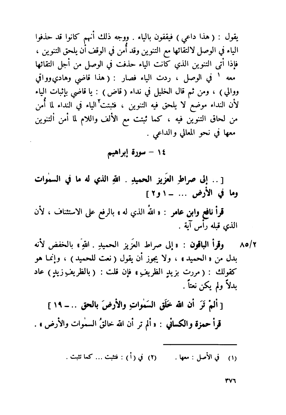 يَقُول هَذَا دَاعِي فيقفون بِالْيَاءِ وَوجه ذَلِك أَنهم كَانُوا قد حذفوا الْيَاء فِي الْوَصْل لالتقائها مَعَ التَّنْوِين وَقد أَمن فِي الْوَقْف أَن يلْحق التَّنْوِين فَإِذا أَتَى التَّنْوِين الَّذِي كَانَت الْيَاء حذفت فِي الْوَصْل من أجل التقائها مَعَه فِي الْوَصْل ردَّتْ الْيَاء فَصَارَ هَذَا قَاضِي وهادي وواقي ووالي وَمن ثمَّ قَالَ الْخَلِيل فِي نِدَاء قَاض يَا قَاضِي بِإِثْبَات الْيَاء لِأَن النداء مَوضِع لَا يلْحق فِيهِ التَّنْوِين فثبتت الْيَاء فِي النداء لما أَمن من لحاق التَّنْوِين فِيهِ كَمَا ثبتَتْ مَعَ الْألف وَاللَّام لما أَمن التَّنْوِين مَعهَا فِي نَحْو الْمَعَالِي والداعي
