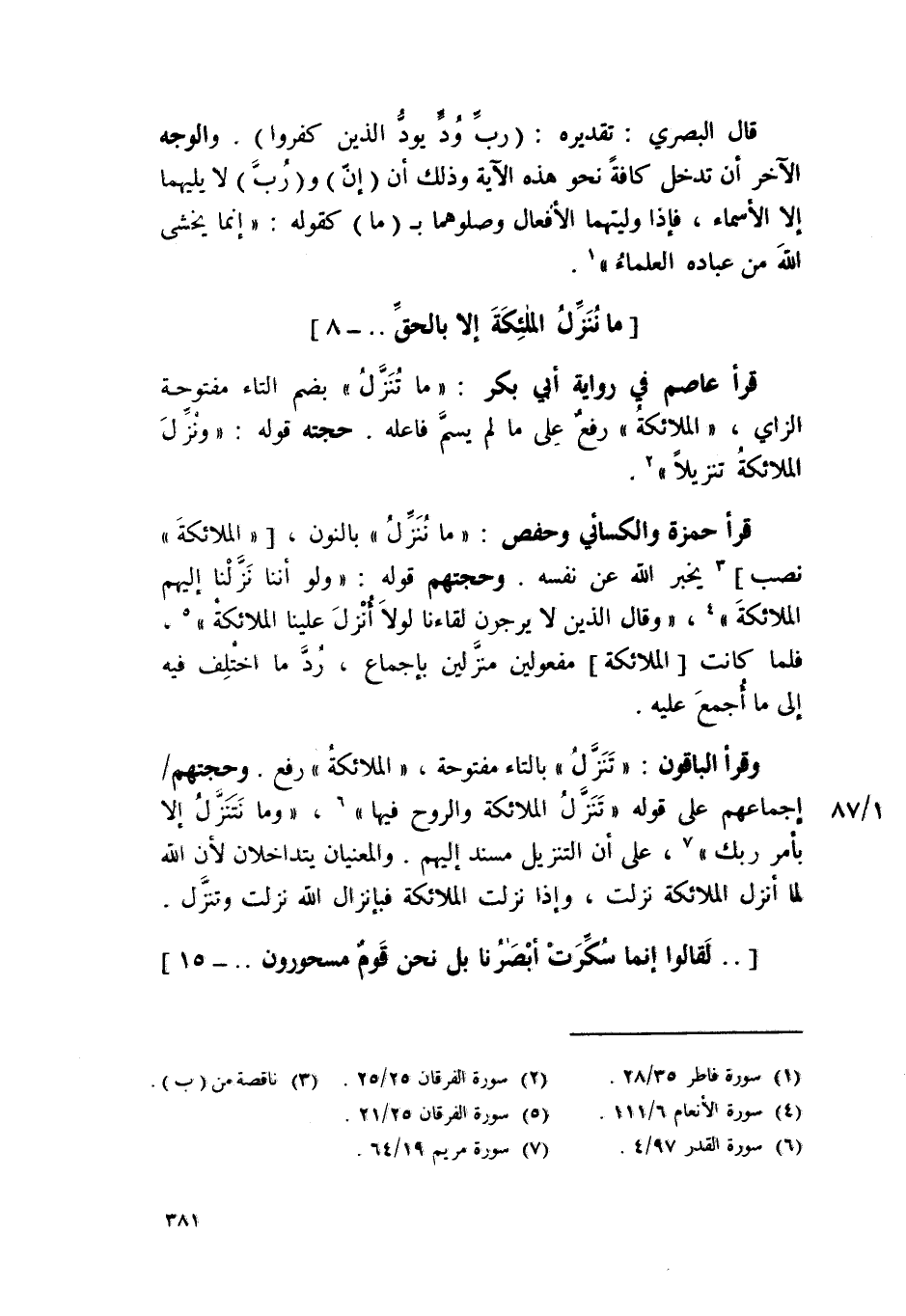 قَرَأَ حَمْزَة وَالْكسَائِيّ وَحَفْص {مَا ننزل} بالنُّون {الْمَلَائِكَة} نصب يخبر الله عَن نَفسه وحجتهم قَوْله {وَلَو أننا نزلنَا إِلَيْهِم الْمَلَائِكَة} {وَقَالَ الَّذين لَا يرجون لقاءنا لَوْلَا أنزل علينا الْمَلَائِكَة} فَلَمَّا كَانَت الْمَلَائِكَة مفعولين منزلين بِإِجْمَاع رد مَا اخْتلف فِيهِ إِلَى مَا أجمع عَلَيْهِ