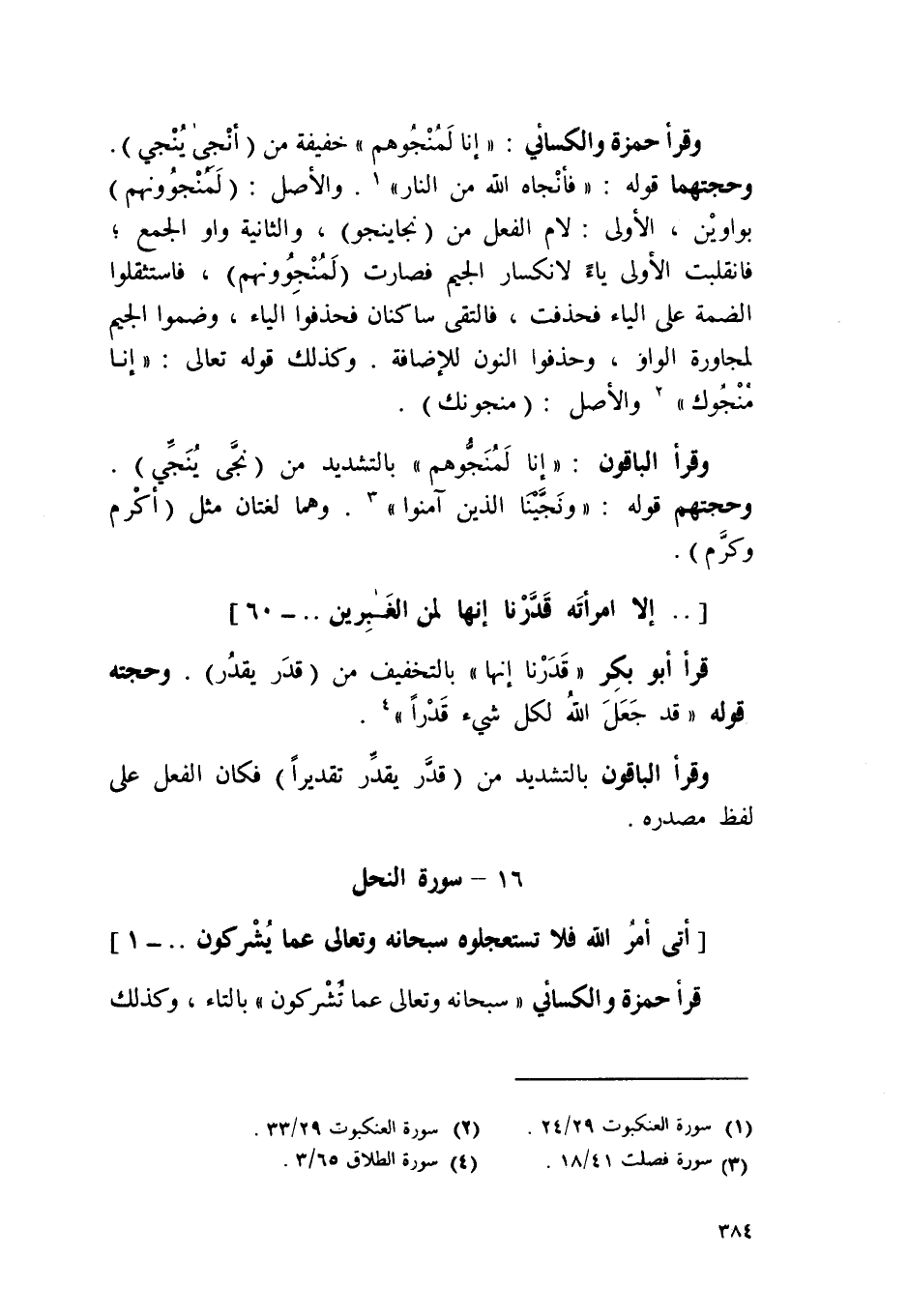 وَقَرَأَ الْبَاقُونَ {إِنَّا لمنجوهم} بِالتَّشْدِيدِ من نجى يُنجي وحجتهم قَوْله {ونجينا الَّذين آمنُوا} وهما لُغَتَانِ مثل أكْرم وكرم