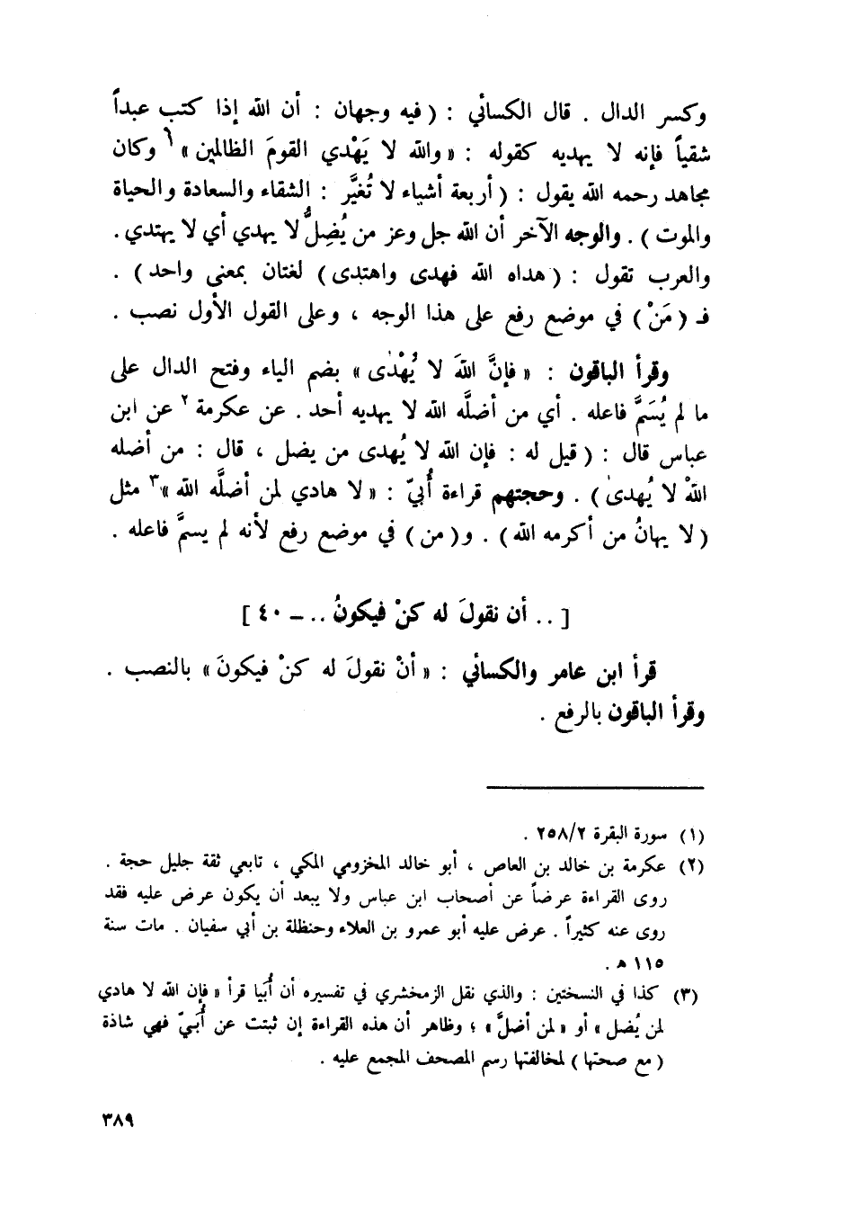 وَقَرَأَ الْبَاقُونَ {فَإِن الله لَا يهدي} بِضَم الْيَاء وَفتح الدَّال على مَا لم يسم فَاعله أَي من أضلّهُ الله لَا يهديه أحد عَن عِكْرِمَة عَن ابْن عَبَّاس قَالَ قيل لَهُ فَإِن الله لَا يهدي من يضل قَالَ من أضلّهُ الله لَا يهدى وحجتهم قِرَاءَة أبي / لَا هادي لمن أضلّهُ الله / مثل لَا يهان من أكْرمه الله وَمن فِي مَوضِع رفع لِأَنَّهُ لم يسم فَاعله