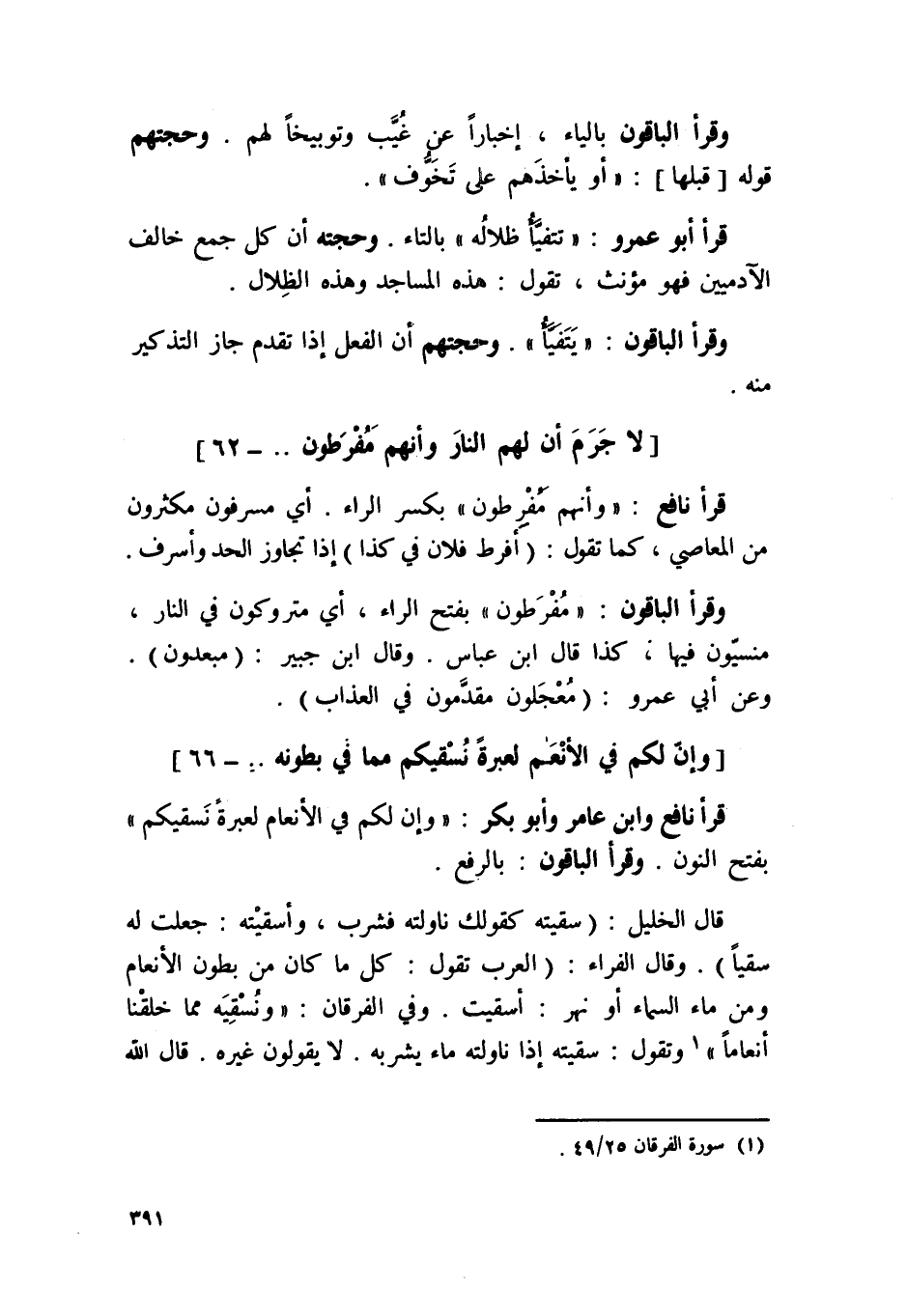 قَرَأَ نَافِع وَابْن عَامر وَأَبُو بكر {وَإِن لكم فِي الْأَنْعَام لعبرة نسقيكم} بِفَتْح النُّون وَقَرَأَ الْبَاقُونَ بِالرَّفْع