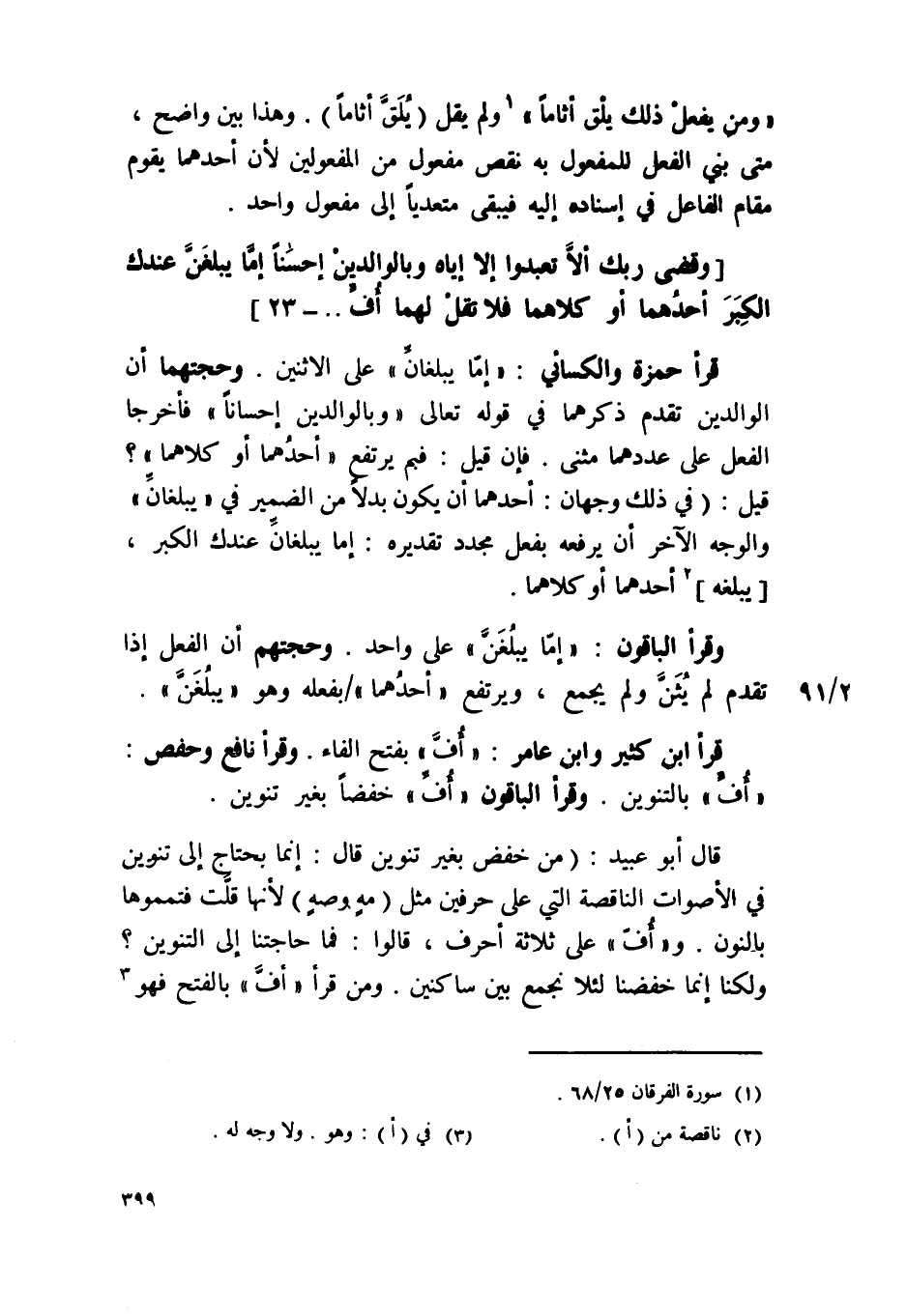 وَقَرَأَ الْبَاقُونَ {إِمَّا يبلغن} على وَاحِد وحجتهم أَن الْفِعْل إِذا تقدم لم يثن وَلم يجمع ويرتفع {أَحدهمَا} بِفِعْلِهِ وَهُوَ {يبلغن}