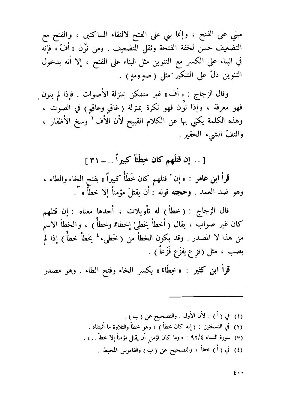 قَالَ الزّجاج خطأ لَهُ تأويلات احدها مَعْنَاهُ إِن قَتلهمْ كَانَ غير صَوَاب يُقَال أَخطَأ يُخطئ إخطاء وَخطأ وَالْخَطَأ الِاسْم من هَذَا لَا الْمصدر وَقد يكون الْخَطَأ من خطئَ يخطأ خطأ إِذا لم يصب مثل فزع يفزع فَزعًا