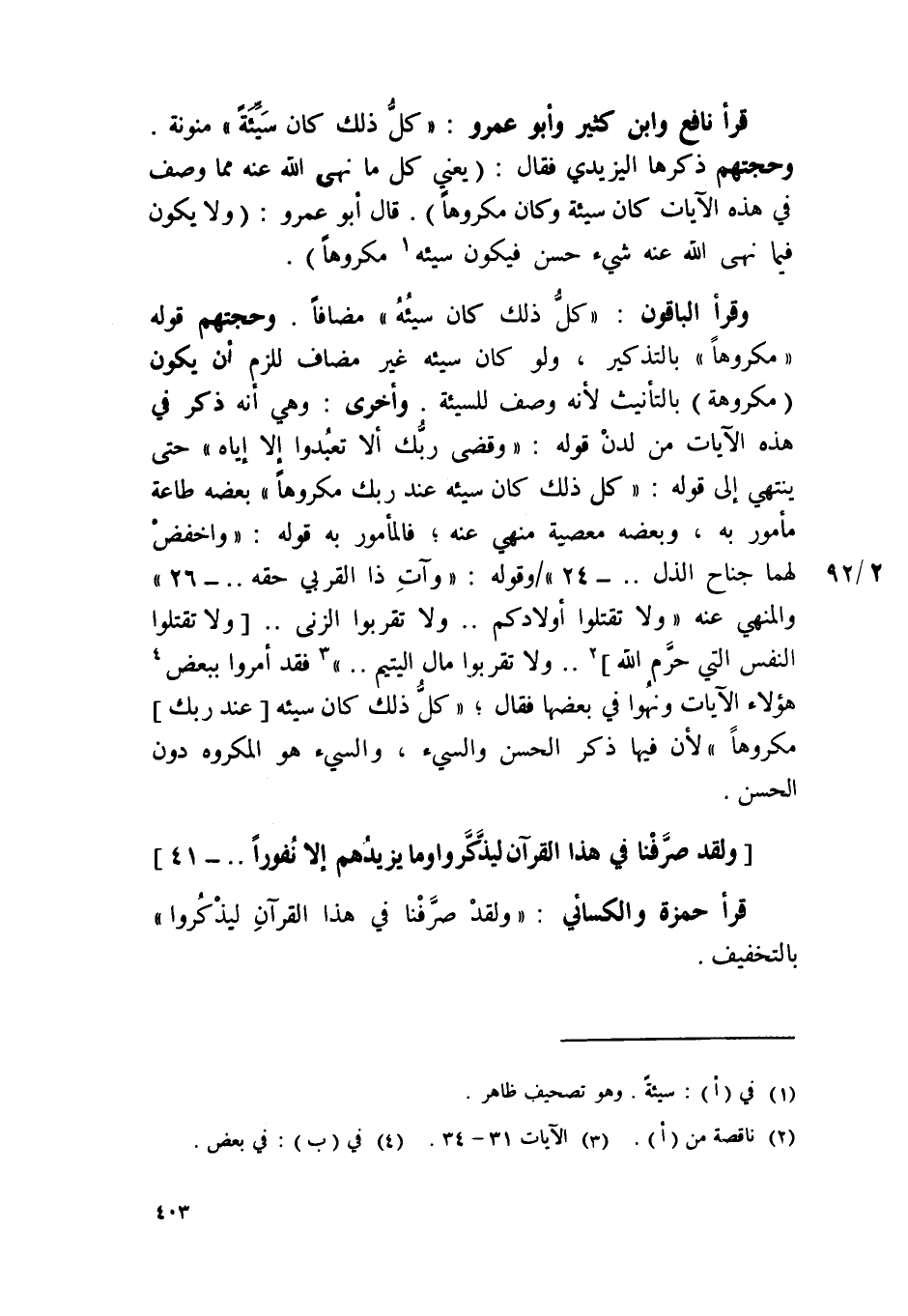 قَرَأَ نَافِع وَابْن كثير وَأَبُو عَمْرو {كل ذَلِك كَانَ سيئه} منونة وحجتهم ذكرهَا اليزيدي فَقَالَ يَعْنِي كل مَا نهى الله عَنهُ مِمَّا وصف فِي هَذِه الْآيَات كَانَ سَيِّئَة وَكَانَ مَكْرُوها قَالَ أَبُو عَمْرو وَلَا يكون فِيمَا نهى الله عَنهُ شَيْء حسن فَيكون سيئه مَكْرُوها