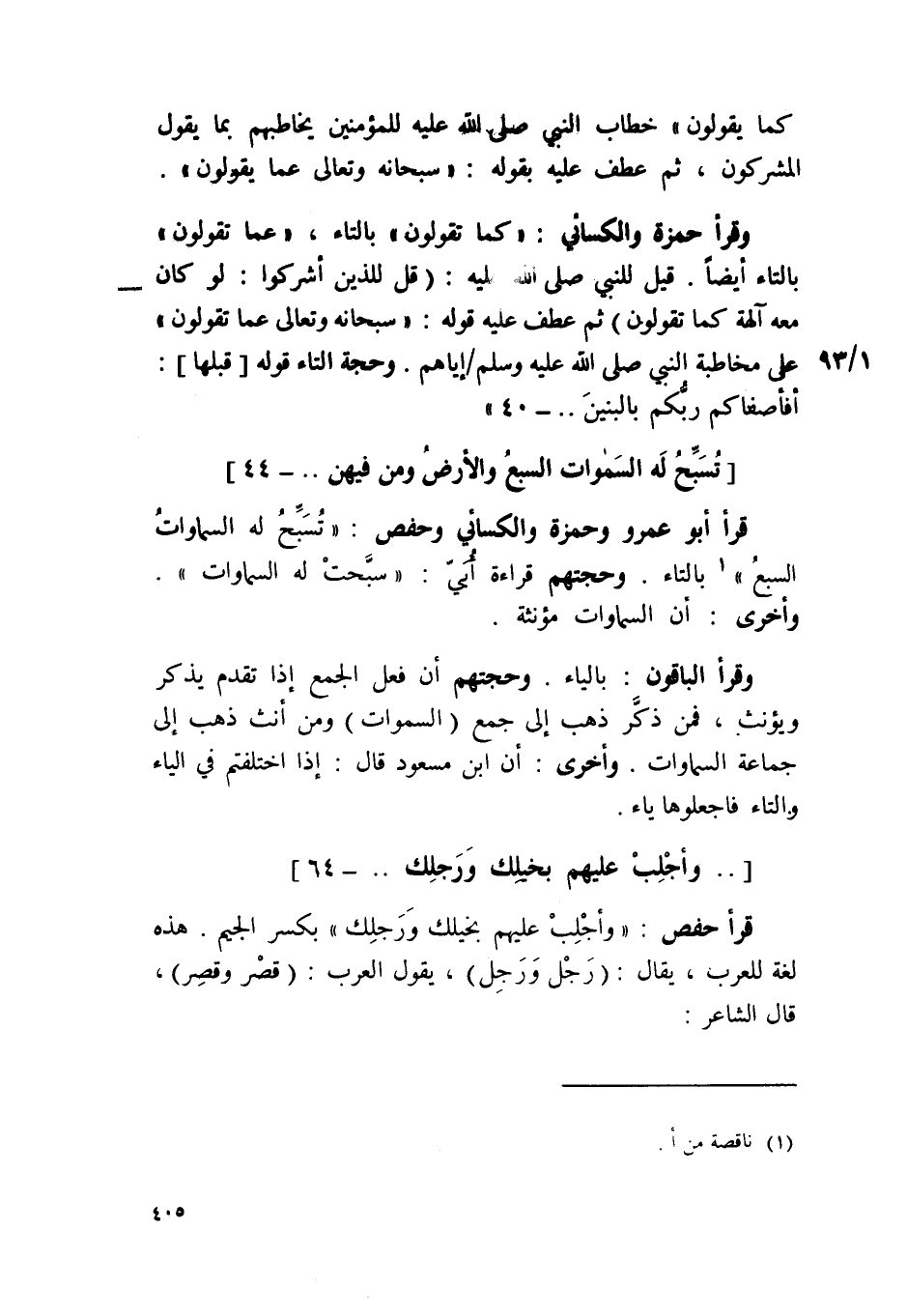 وَقَرَأَ حَمْزَة وَالْكسَائِيّ / كَمَا تَقولُونَ / بِالتَّاءِ / عَمَّا تَقولُونَ / بِالتَّاءِ أَيْضا قيل للنَّبِي صلى الله عَلَيْهِ قل للَّذين أشركوا لَو كَانَ مَعَه آلِهَة كَمَا تَقولُونَ ثمَّ عطف عَلَيْهِ قَوْله / سُبْحَانَهُ وَتَعَالَى عَمَّا تَقولُونَ / على مُخَاطبَة النَّبِي صلى الله عَلَيْهِ وَسلم إيَّاهُم وَحجَّة التَّاء قَوْله قبلهَا {أفأصفاكم ربكُم بالبنين}