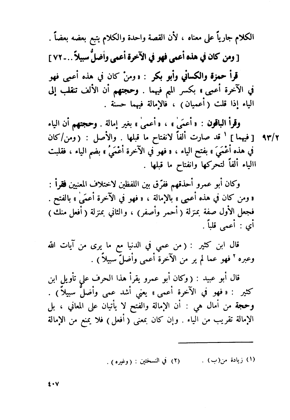 قَالَ أَبُو عبيد وَكَانَ أَبُو عَمْرو يقْرَأ هَذَا الْحَرْف على تَأْوِيل ابْن كثير {فَهُوَ فِي الْآخِرَة أعمى} يَعْنِي أَشد عمى وأضل سَبِيلا وَحجَّة من أمال هِيَ أَن الإمالة وَالْفَتْح لَا يأتيان على الْمعَانِي بل الإمالة تقريب من الْيَاء وَإِن كَانَ بِمَعْنى أفعل فَلَا يمْنَع من الإمالة