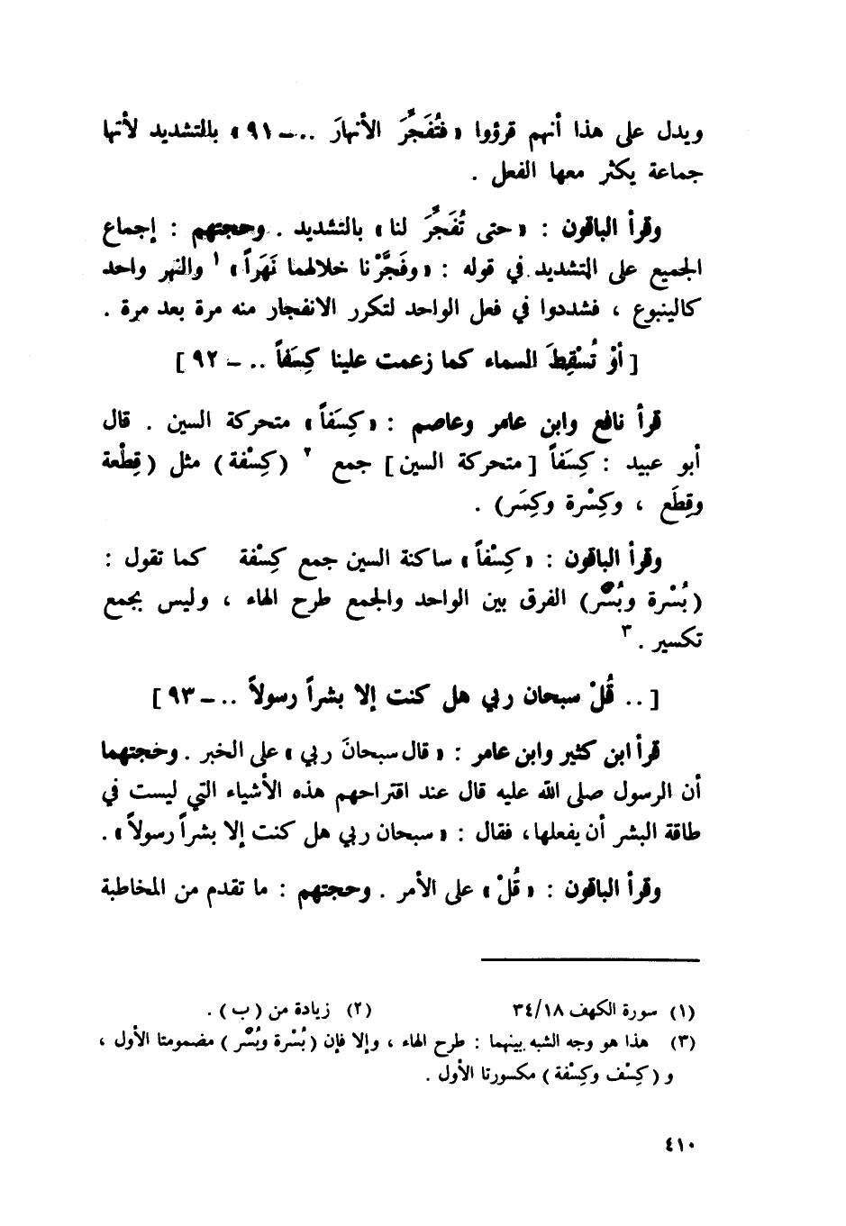 وَقَرَأَ الْبَاقُونَ {حَتَّى تفجر لنا} بِالتَّشْدِيدِ وحجتهم إِجْمَاع الْجَمِيع على التَّشْدِيد فِي قَوْله {وفجرنا خلالهما نَهرا} وَالنّهر وَاحِد كالينبوع فشددوا فِي فعل الْوَاحِد لتكرر الانفجار مِنْهُ مرّة بعد مرّة