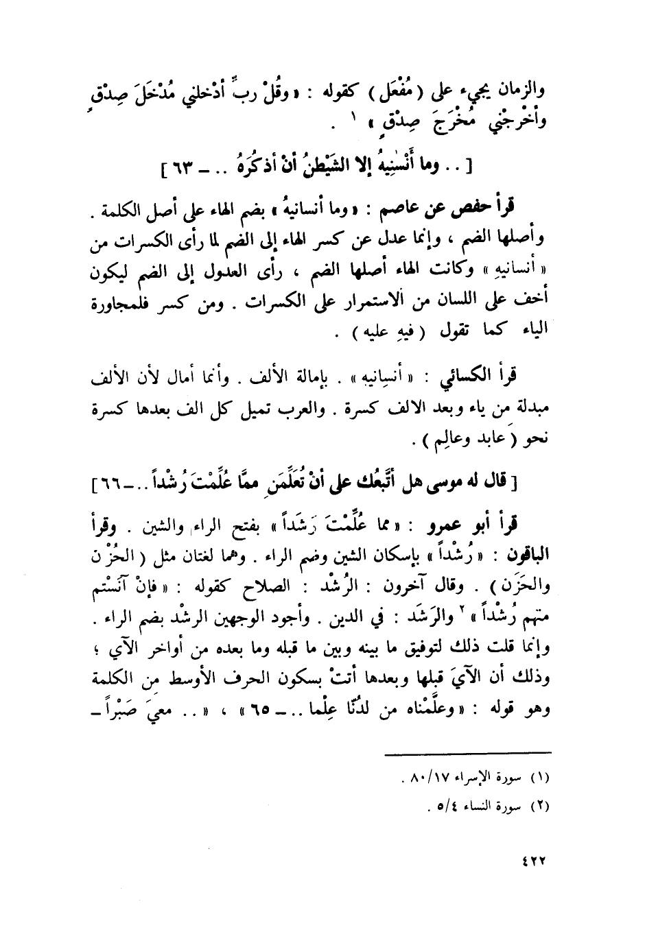 قَرَأَ أَبُو عَمْرو {مِمَّا علمت رشدا} بِفَتْح الرَّاء والشين وَقَرَأَ الْبَاقُونَ {رشدا} بِإِسْكَان الشين وَضم الرَّاء وهما لُغَتَانِ مثل الْحزن والحزن وَقَالَ آخَرُونَ الرشد الصّلاح كَقَوْلِه {فَإِن آنستم مِنْهُم رشدا} والرشد فِي الدّين وأجود الْوَجْهَيْنِ الرشد بِضَم الرَّاء وَإِنَّمَا قلت ذَلِك لتوفيق مَا بَينه وَبَين مَا قبله وَمَا بعده من أَوَاخِر الْآي وَذَلِكَ أَن الْآي قبلهَا وَبعدهَا أَتَت بِسُكُون الْحَرْف الْأَوْسَط من الْكَلِمَة وَهُوَ قَوْله {وعلمناه من لدنا علما} {معي صبرا}