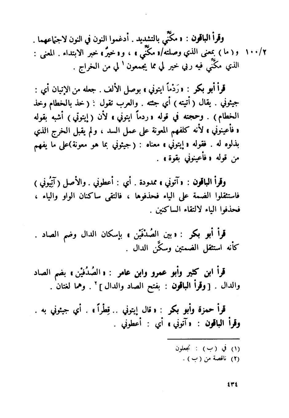 قَرَأَ حَمْزَة وَأَبُو بكر / قَالَ إيتوني قطرا / أَي جيئوني بِهِ وَقَرَأَ الْبَاقُونَ {آتوني} أَي أعطوني