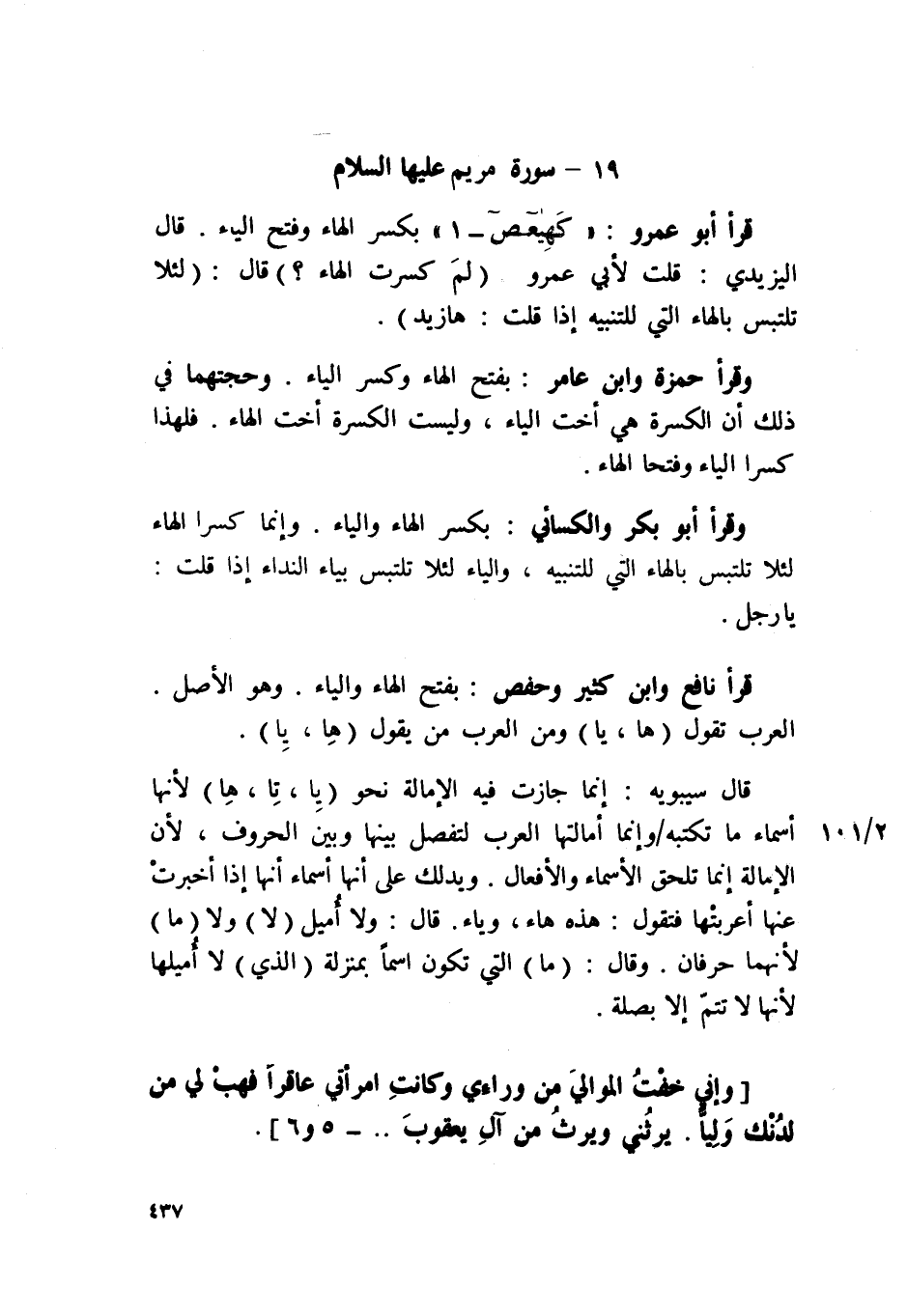 قَرَأَ أَبُو عَمْرو {كهيعص} بِكَسْر الْهَاء وَفتح الْيَاء قَالَ اليزيدي قلت لأبي عَمْرو لم كسرت الْهَاء قَالَ لِئَلَّا تَلْتَبِس بِالْهَاءِ الَّتِي للتّنْبِيه إِذا قلت هَا زيد