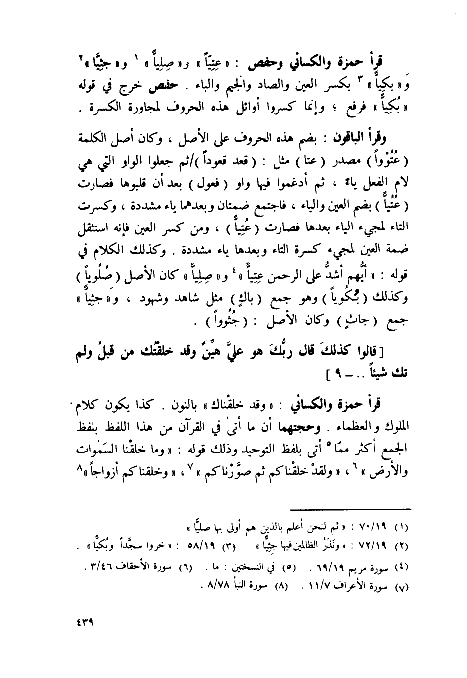 قَرَأَ حَمْزَة وَالْكسَائِيّ وَحَفْص {عتيا} و {صليا} و {جثيا} و {وبكيا} بِكَسْر الْعين وَالصَّاد وَالْجِيم وَالْبَاء حَفْص خرج فِي قَوْله {وبكيا} فَرفع وَإِنَّمَا كسروا أَوَائِل هَذِه الْحُرُوف لمجاورة الكسرة