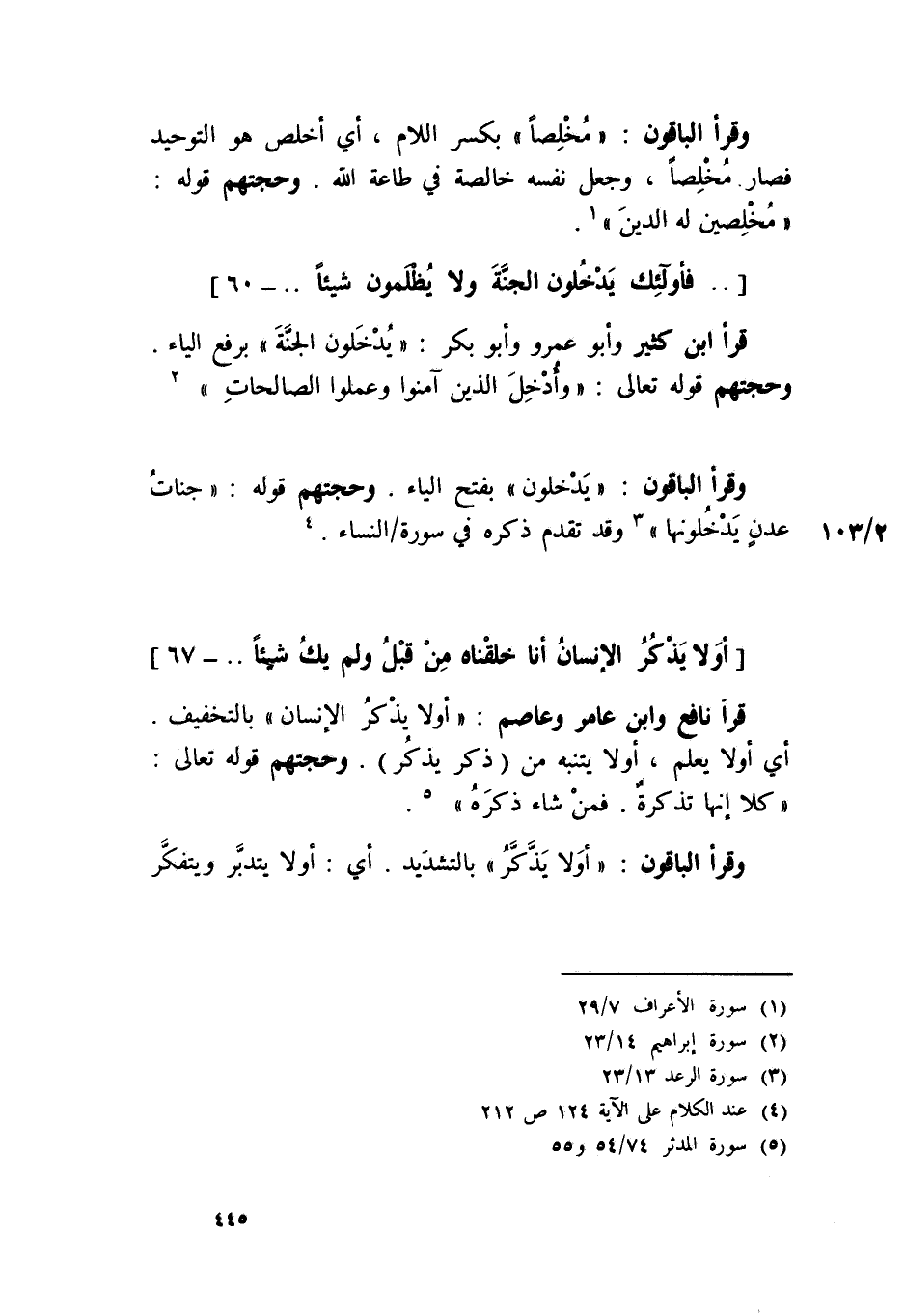 قَرَأَ ابْن كثير وَأَبُو عَمْرو وَأَبُو بكر {يدْخلُونَ الْجنَّة} بِرَفْع الْيَاء وحجتهم قَوْله تَعَالَى {وَأدْخل الَّذين آمنُوا وَعمِلُوا الصَّالِحَات}