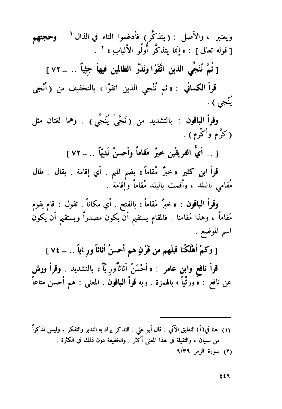قَرَأَ الْكسَائي {ثمَّ ننجي الَّذين اتَّقوا} بِالتَّخْفِيفِ من أنجى يُنجي