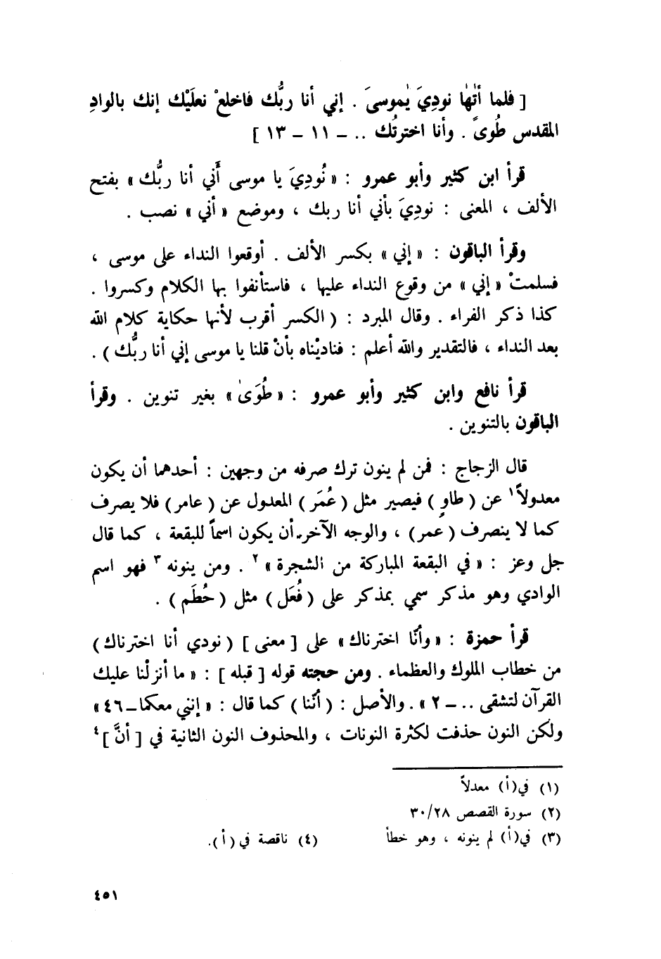 قَرَأَ نَافِع وَابْن كثير وَأَبُو عَمْرو {طوى} بِغَيْر تَنْوِين وَقَرَأَ الْبَاقُونَ بِالتَّنْوِينِ