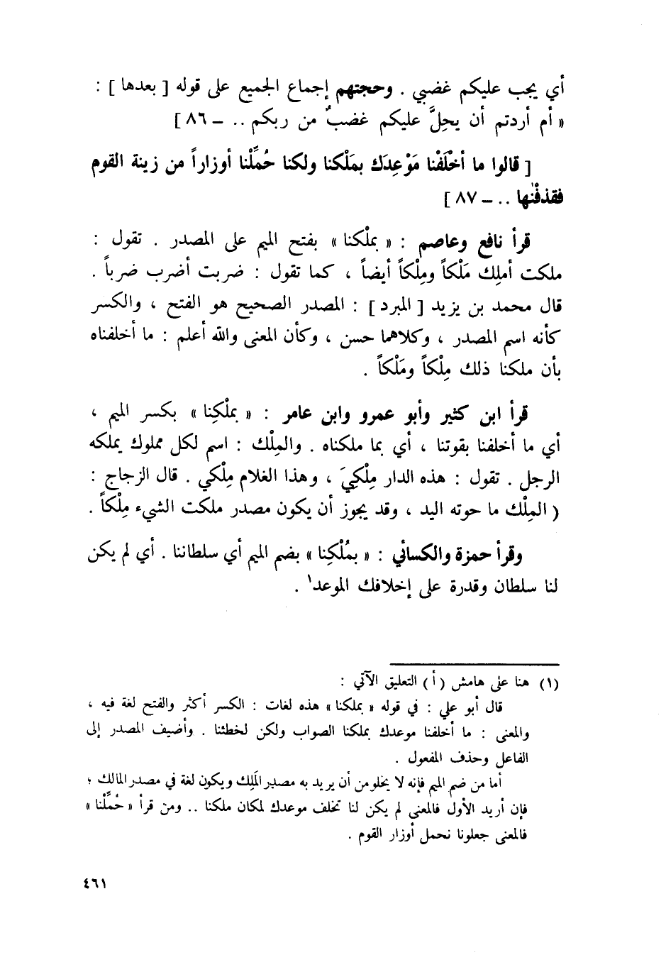 قَرَأَ ابْن كثير وَأَبُو عَمْرو وَابْن عَامر {بملكنا} بِكَسْر الْمِيم أَي مَا أخلفنا بقوتنا أَي بِمَا ملكناه وَالْملك اسْم لكل مَمْلُوك يملكهُ الرجل تَقول هَذِه الدَّار ملكي وَهَذَا الْغُلَام ملكي قَالَ الزّجاج الْملك مَا حوته الْيَد وَقد يجوز أَن يكون مصدر ملكت الشَّيْء ملكا