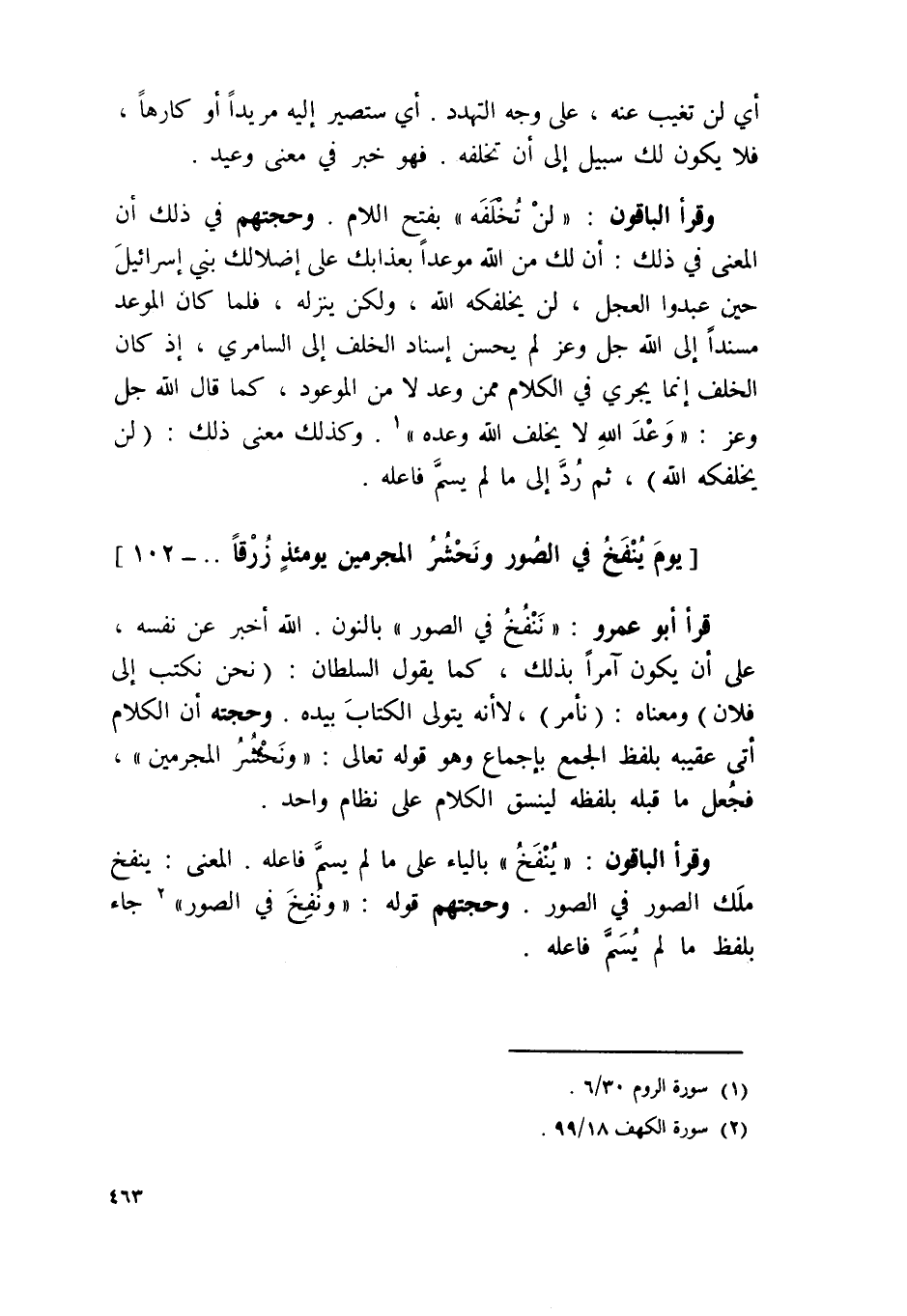 قَرَأَ أَبُو عَمْرو / ننفخ فِي الصُّور / بالنُّون الله أخبر عَن نَفسه على أَن يكون آمرا بذلك كَمَا يَقُول السُّلْطَان نَحن نكتب إِلَى فلَان وَمَعْنَاهُ نأمر لَا أَنه يتَوَلَّى الْكتاب بِيَدِهِ وحجته أَن الْكَلَام أَتَى عَقِيبه بِلَفْظ الْجمع بِإِجْمَاع وَهُوَ قَوْله تَعَالَى {ونحشر الْمُجْرمين} فَجعل مَا قبله بِلَفْظِهِ لينسق الْكَلَام على نظام وَاحِد