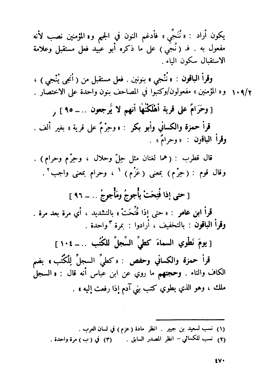 وَقَرَأَ الْبَاقُونَ {ننجي} بنونين فعل مُسْتَقْبل من أنجى يُنجي و {الْمُؤمنِينَ} معفولون وَكَتَبُوا فِي الْمَصَاحِف بنُون وَاحِد على الِاخْتِصَار