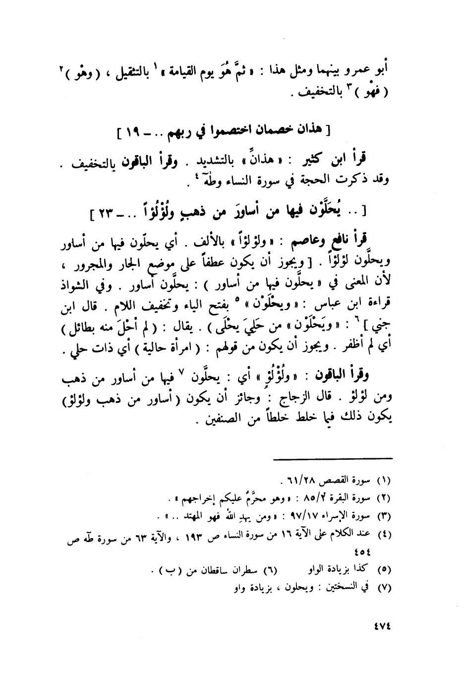 وَقَرَأَ الْبَاقُونَ / ولؤلؤ / أَي يحلونَ فِيهَا من أساور من ذهب وَمن لُؤْلُؤ قَالَ الزّجاج وَجَائِز أَن يكون أساور من ذهب ولؤلؤ يكون ذَلِك فِيمَا خلط خلطا من الصِّنْفَيْنِ