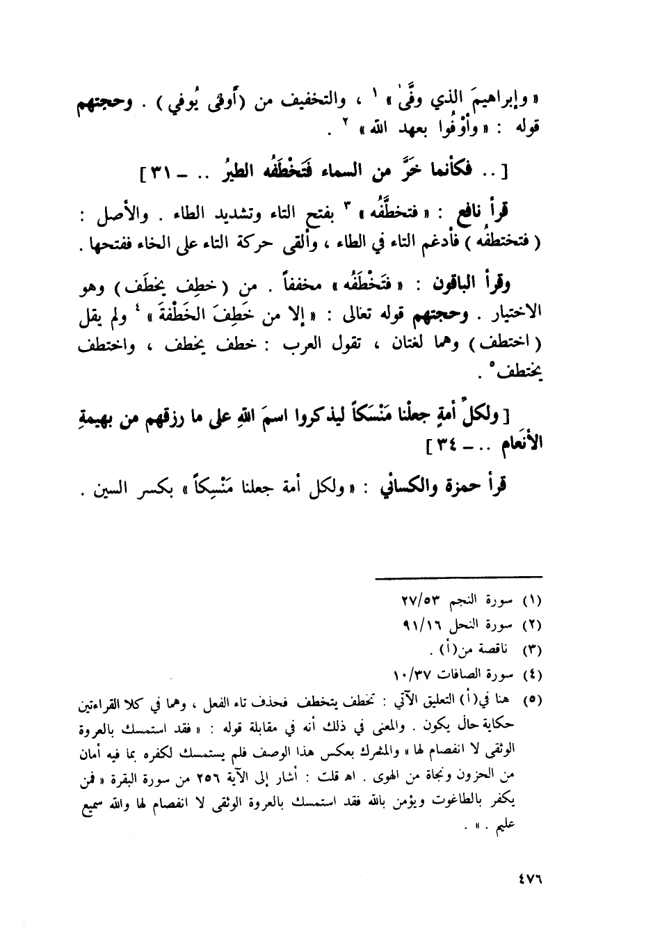 قَرَأَ نَافِع {فتخطفه} بِفَتْح التَّاء وَتَشْديد الطَّاء وَالْأَصْل فتختطفه فأدغم التَّاء فِي الطَّاء وَألقى حَرَكَة التَّاء على الْخَاء فَفَتحهَا