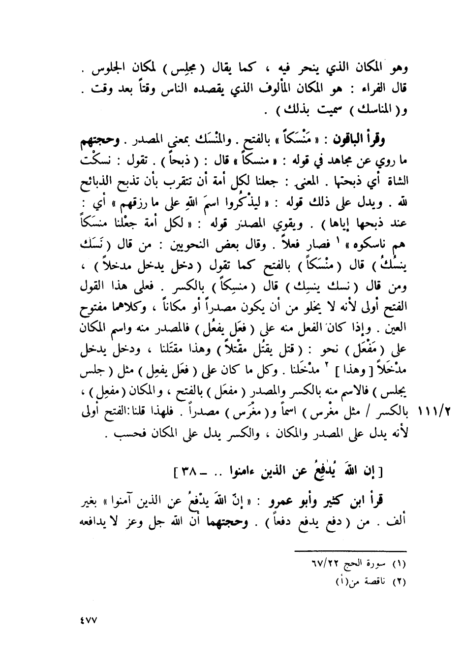 وَقَرَأَ الْبَاقُونَ {منسكا} بِالْفَتْح والمنسك بِمَعْنى الْمصدر وحجتهم مَا رُوِيَ عَن مُجَاهِد فِي قَوْله {منسكا} قَالَ ذبحا تَقول نسكت الشَّاة أَي ذبحتها الْمَعْنى جعلنَا لكل أمة أَن تتقرب بِأَن تذبح الذَّبَائِح لله وَيدل على ذَلِك قَول {لِيذكرُوا اسْم الله على مَا رزقهم} أَي عِنْد ذَبحهَا إِيَّاهَا وَيُقَوِّي الْمصدر قَوْله {لكل أمة جعلنَا منسكا هم ناسكوه} فَصَارَ فعلا وَقَالَ بعض النَّحْوِيين من قَالَ نسك ينْسك قَالَ منسكا بِالْفَتْح كَمَا تَقول دخل يدْخل مدخلًا وَمن قَالَ نسك ينْسك قَالَ منسكا بِالْكَسْرِ فعلى هَذَا القَوْل الْفَتْح أولى لِأَنَّهُ لَا يَخْلُو من أَن يكون مصدرا أَو مَكَانا وَكِلَاهُمَا مَفْتُوح الْعين وَإِذا كَانَ الْفِعْل مِنْهُ على فعل يفعل فالمصدر مِنْهُ وَاسم الْمَكَان على مفعل نَحْو قتل يقتل مقتلا وَهَذَا مقتلنا وَدخل يدْخل مدخلًا وَهَذَا مدخلنا وكل مَا كَانَ على فعل يفعل مثل جلس يجلس فالاسم مِنْهُ بِالْكَسْرِ والمصدر مفعل بِالْفَتْح وَالْمَكَان مفعل بِالْكَسْرِ مثل مغرس اسْما ومغرس مصدرا فَلهَذَا قُلْنَا الْفَتْح أولى لِأَنَّهُ يدل على الْمصدر وَالْمَكَان وَالْكَسْر يدل على الْمَكَان فَحسب
