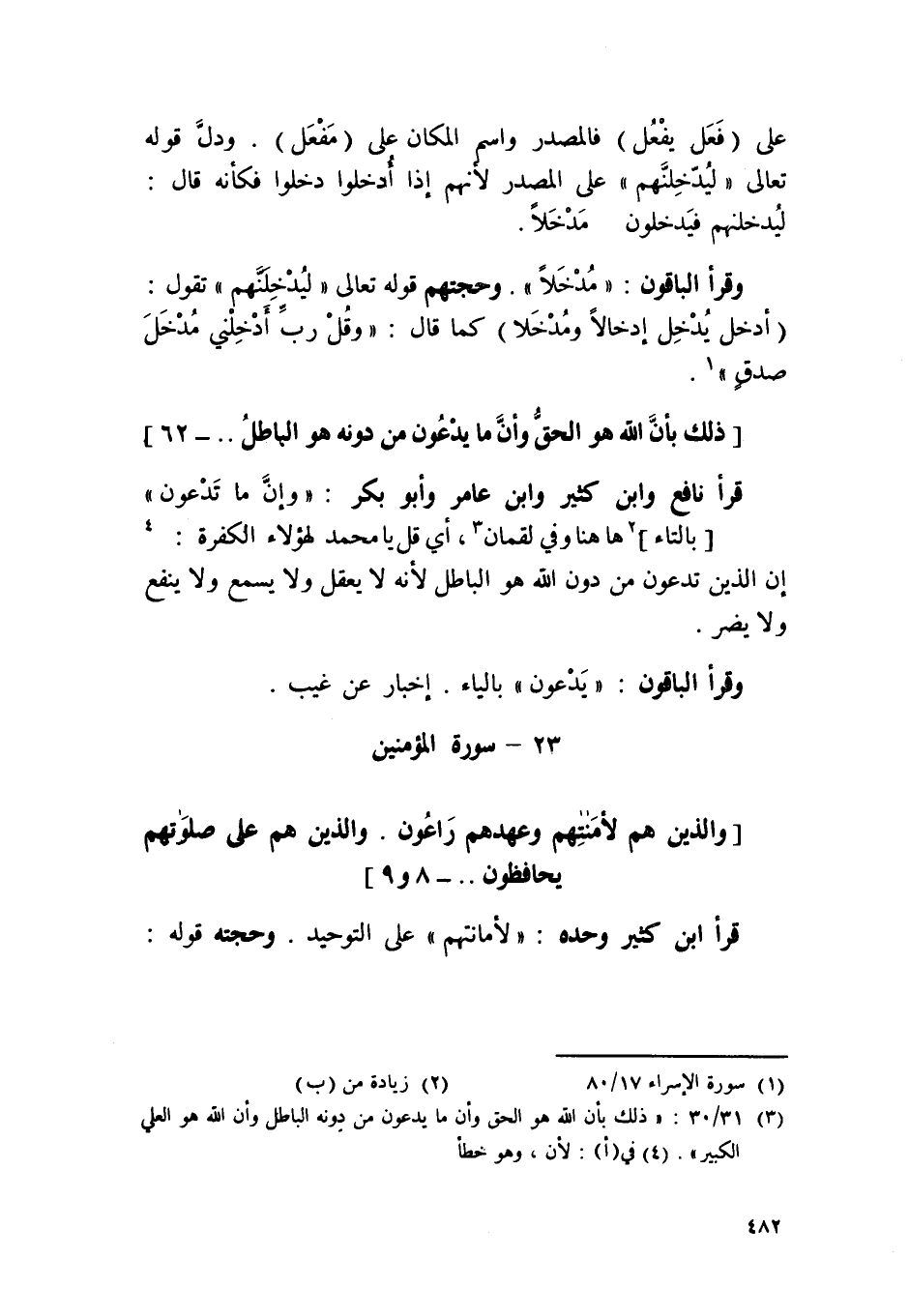 وَقَرَأَ الْبَاقُونَ {مدخلًا} وحجتهم قَوْله تَعَالَى {ليدخلنهم} تَقول أَدخل يدْخل إدخالا ومدخلا كَمَا قَالَ {وَقل رب أدخلني مدْخل صدق}