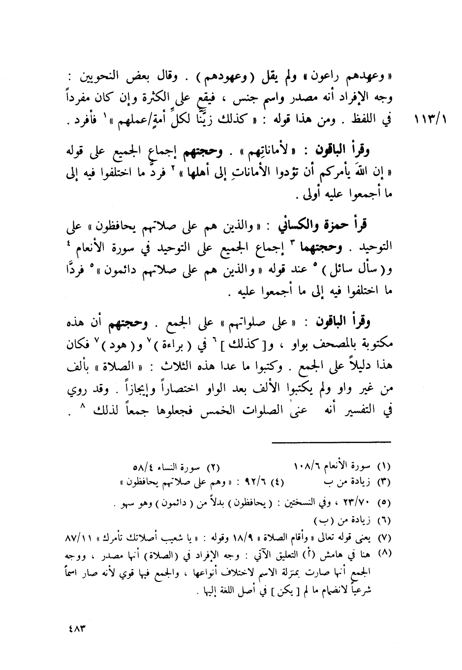 وَقَرَأَ الْبَاقُونَ {على صلواتهم} على الْجمع وحجتهم أَن هَذِه مَكْتُوبَة بالمصحف بواو وَكَذَلِكَ فِي بَرَاءَة وَهود فَكَانَ هَذَا دَلِيلا على الْجمع وَكَتَبُوا مَا عدا هَذِه الثَّلَاث {الصَّلَاة} بِأَلف من غير وَاو وَلم يكتبوا الْألف بعد الْوَاو اختصارا وإيجازا وَقد رُوِيَ فِي التَّفْسِير أَنه عَنى الصَّلَوَات الْخمس فجعلوها جمعا لذَلِك