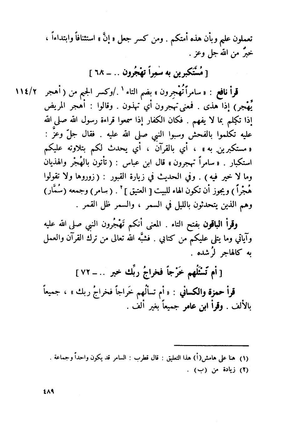 قَرَأَ نَافِع {سامرا تهجرون} بِضَم التَّاء وَكسر الْجِيم من أَهجر يهجر إِذا هذى فَمَعْنَى تهجرون أَي تهذون وَقَالُوا أَهجر الْمَرِيض إِذا تكلم بِمَا لَا يفهم فَكَانَ الْكفَّار إِذا سمعُوا قِرَاءَة رَسُول الله صلى الله عَلَيْهِ تكلمُوا بالفحش وَسبوا النَّبِي صلى الله عَلَيْهِ فَقَالَ جلّ وَعز {مستكبرين بِهِ} أَي بِالْقُرْآنِ أَي يحدث لكم بتلاوته عَلَيْكُم استكبارا {سامرا تهجرون} قَالَ ابْن عَبَّاس تأتون بالهجر والهذيان وَمَا لَا خير فِيهِ وَفِي الحَدِيث فِي زِيَارَة الْقُبُور