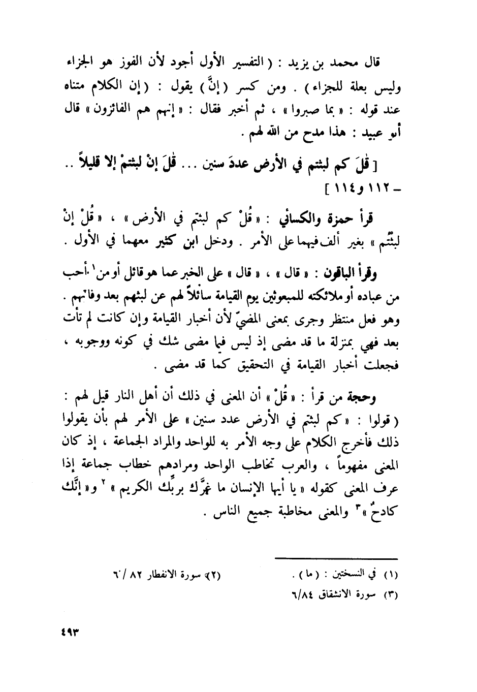 قَرَأَ حَمْزَة وَالْكسَائِيّ / قل كم لبثتم فِي الأَرْض / / قل إِن لبثتم / بِغَيْر ألف فيهمَا على الْأَمر وَدخل ابْن كثير مَعَهُمَا فِي الأول