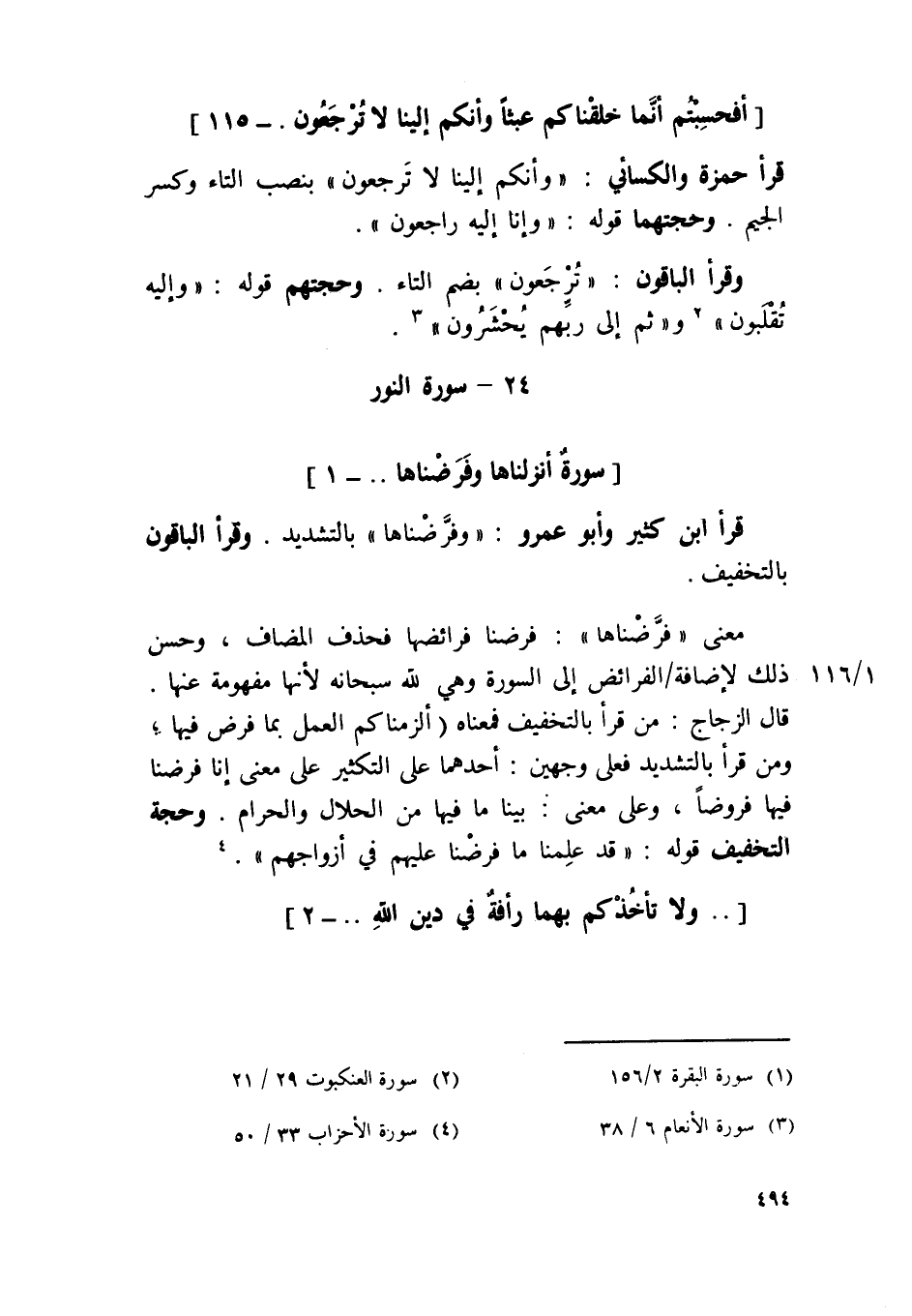 قَرَأَ حَمْزَة وَالْكسَائِيّ {وأنكم إِلَيْنَا لَا ترجعون} بِنصب التَّاء وَكسر الْجِيم وحجتهم قَوْله {وَإِنَّا إِلَيْهِ رَاجِعُون}