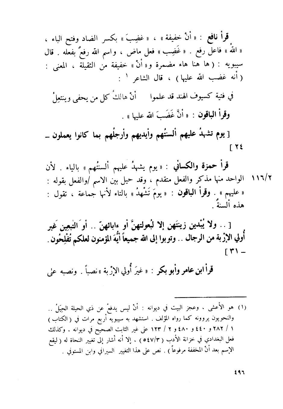 قَرَأَ نَافِع {إِن} خَفِيفَة {غضب} بِكَسْر الضَّاد وَفتح الْبَاء {الله} فَاعل رفع {غضب} فعل مَاض وَاسم الله رفع بِفِعْلِهِ قَالَ سِيبَوَيْهٍ هَا هُنَا هَاء مضمرة وَأَن خَفِيفَة من الثَّقِيلَة الْمَعْنى أَنه غضب الله عَلَيْهَا قَالَ الشَّاعِر ... فِي فتية كسيوف الْهِنْد قد علمُوا ... أَن هَالك كل من يحفى وينتعل ...