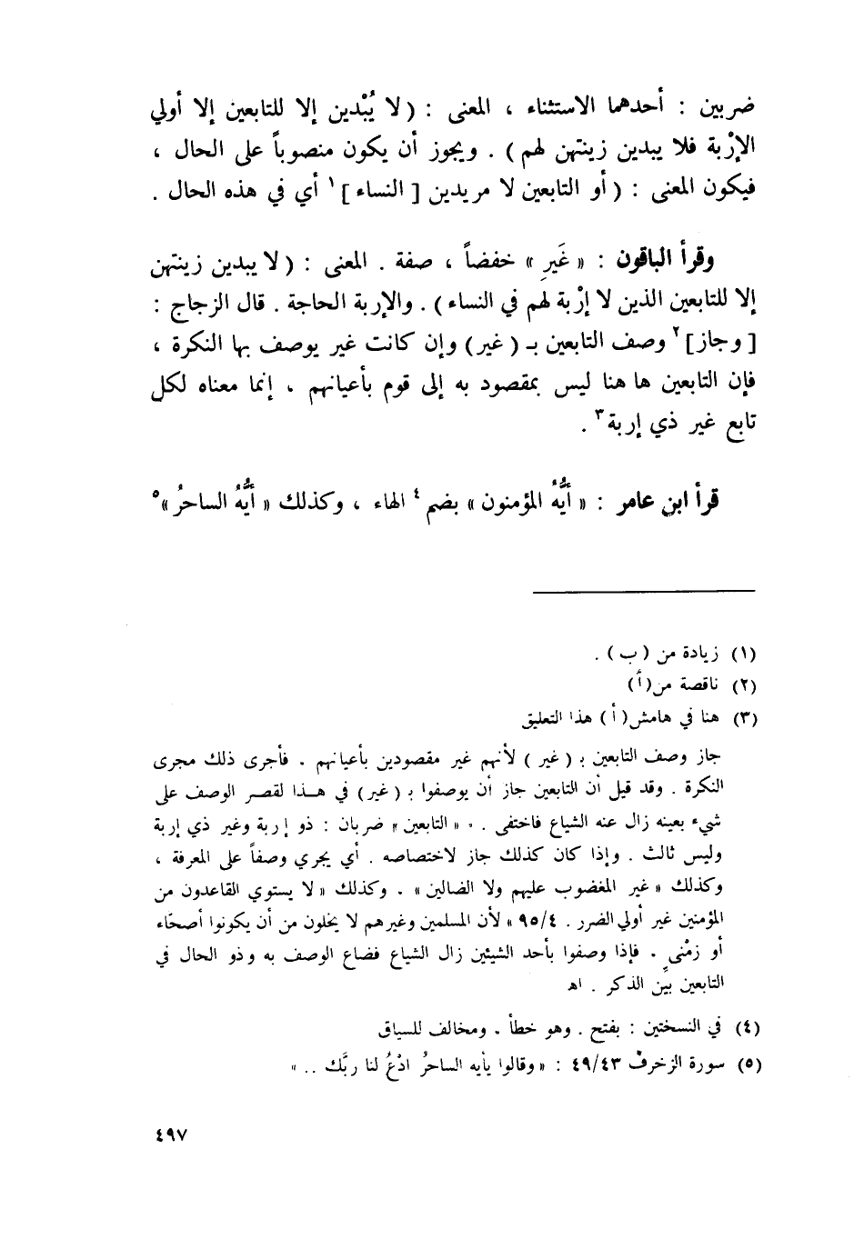 ضَرْبَيْنِ أَحدهمَا الِاسْتِثْنَاء الْمَعْنى لَا يبدين إِلَّا للتابعين إِلَّا أولي الإربة فَلَا يبدين زينتهن لَهُم وَيجوز أَن يكون مَنْصُوبًا على الْحَال فَيكون الْمَعْنى أَو التَّابِعين لَا مريدين النِّسَاء أَي فِي هَذِه الْحَال